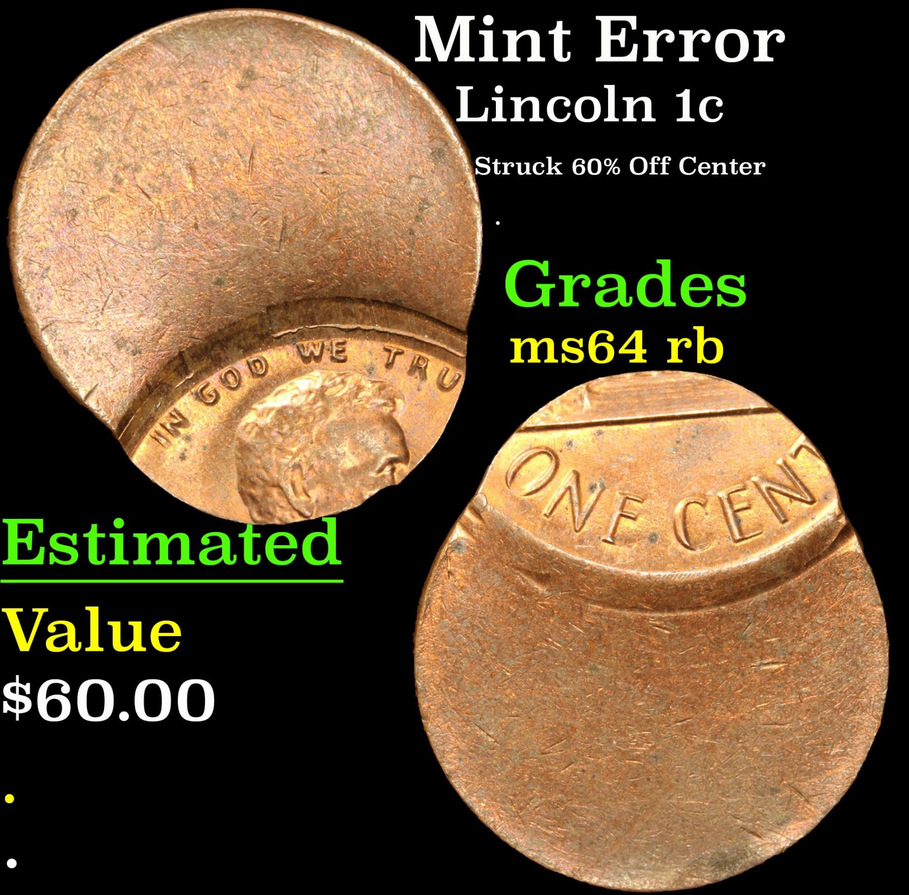 Mint Error Struck 60% Off Center . Lincoln Cent 1c Grades Choice Unc RB.