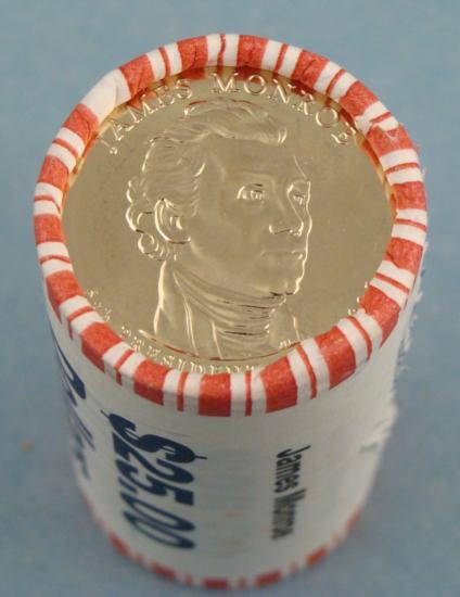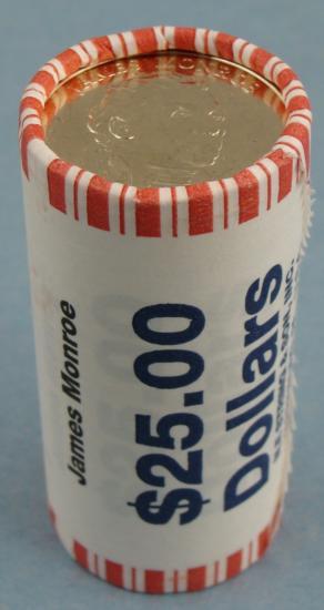 Here is one original bank wrapped roll of the brand new 2007 James Monroe Presidential Dollar. The roll is unopened, and contains 25 coins, all mint, and uncirculated. And since these have not been searched, there might be an error coin here.
