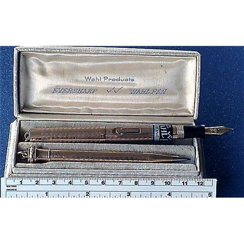 1925 lady's Wahl Eversharp #2 pen & pencil set in original box with the original price tag still on, had been inked, otherwise it is very clean without any scratches engraving brassing or dings.Gold filled metal has alternating pinstripe and chevron design. Nib is very flexible. Propel pencil works. Box considering age had been well preserved. Condition Mint.