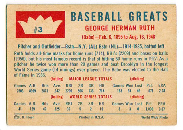 Mint Good Condition 1960 Fleer Babe Ruth New York Yankees #3 Baseball Card