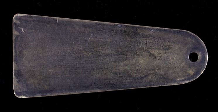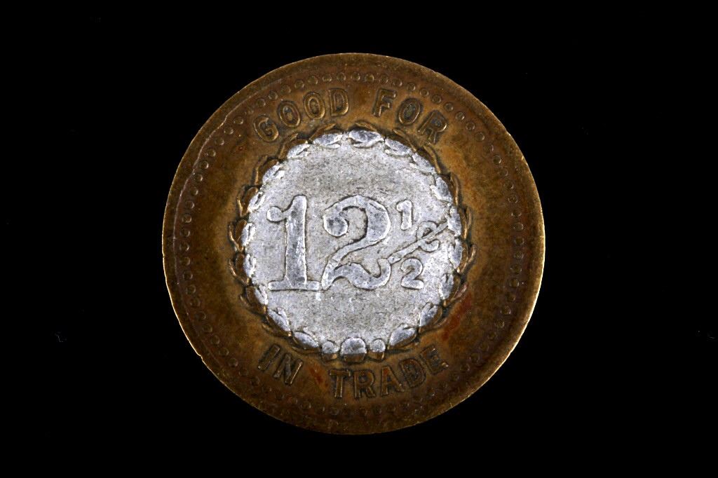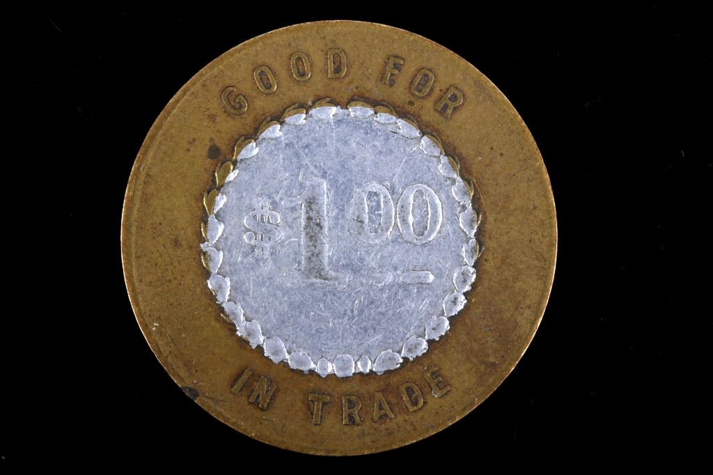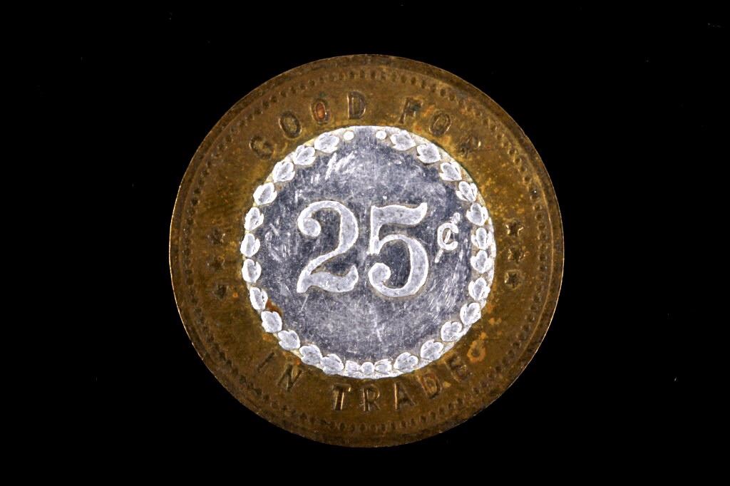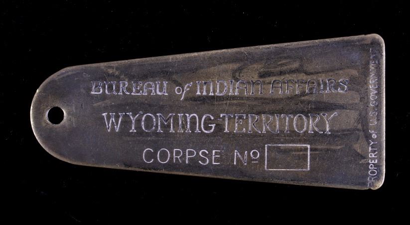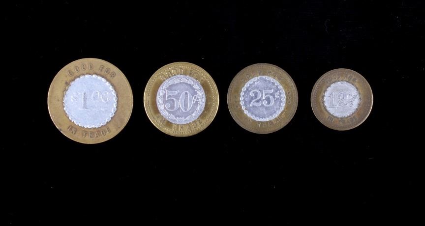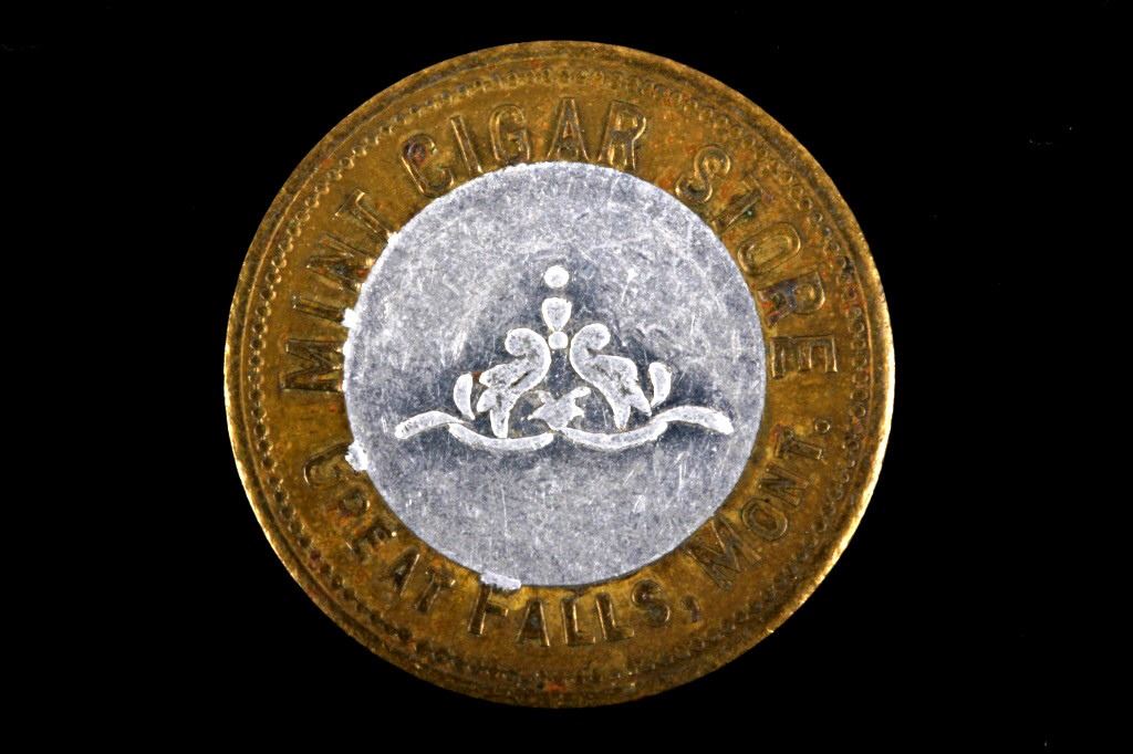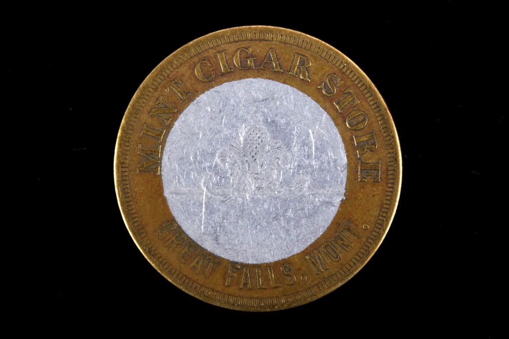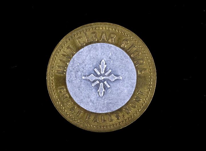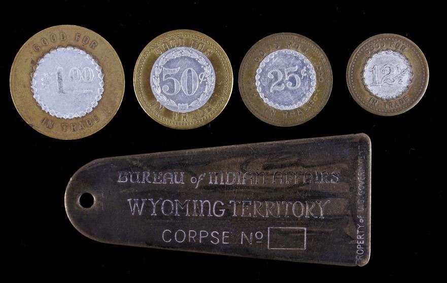 This lot features a set of four bi-metal cigar store trade tokens from Great Falls, Montana. As well as a "Bureau of Indian Affairs - Wyoming Territory" Brass Toe Tag. Each coin is a different size and denomination and each coin bears a slightly different decoration. The largest is about an inch and a half in diameter with the smallest being 3/4" in diameter. The obverse of each token says "Mint Cigar Store" across the top and "Great Falls" across the bottom. In the center is an ornament unique to the token value on the reverse center. The reverse of each coin reads "Good For"--top, "In Trade"--bottom, value in the center. The highest value is $1.00, then descending by half for each other coin down to 12 1/2 cents. The coins are in good condition, though the decoration on the obverse center of the smallest is very worn. The age of the Brass toe-Tag included in the lot is unknown, it does show deep script, and a nice warm finish. The toe-tag features no corpse number. The piece measures 3 5/8" L x 1 5/8" W