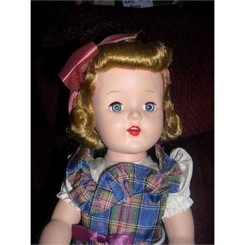 Mint 16" hard plastic walker. Eyes sleep and she has her original wig in original set. This doll has not been played with. Hard plastic has nice matt finish. Original dress with attached plaid taffeta panties. There are two buttons in the back. She has all her eyelashes and she has painted lower lashes. She is from a smoke free environment. If you like mint, you will love her. She is marked Made in the U.S.A. 170 and she's 16" tall. Shoes are marked Fairyland. Buyer to pay $20 for U.S. shipping and insurance. Thanks for viewing.