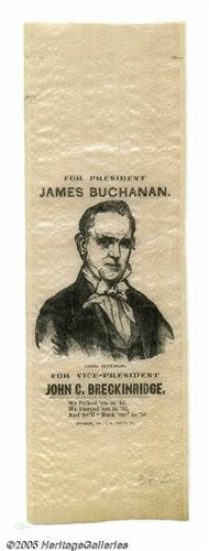 <B>Mint James Buchanan Silk Ribbon</B></I> 2 1/4" x 7" pink silk taffeta ribbon for James Buchanan, part of the set issued for Buchanan, Fremont and Fillmore, in a variety of colors. This is the pink variety. Condition is mint and hard to find, especially considering the fragile nature of such ribbons. It reads, "We Po'ked 'em in '44, We Pierced 'em in '52, And we'll 'buck' 'em in '56!" Lot:256