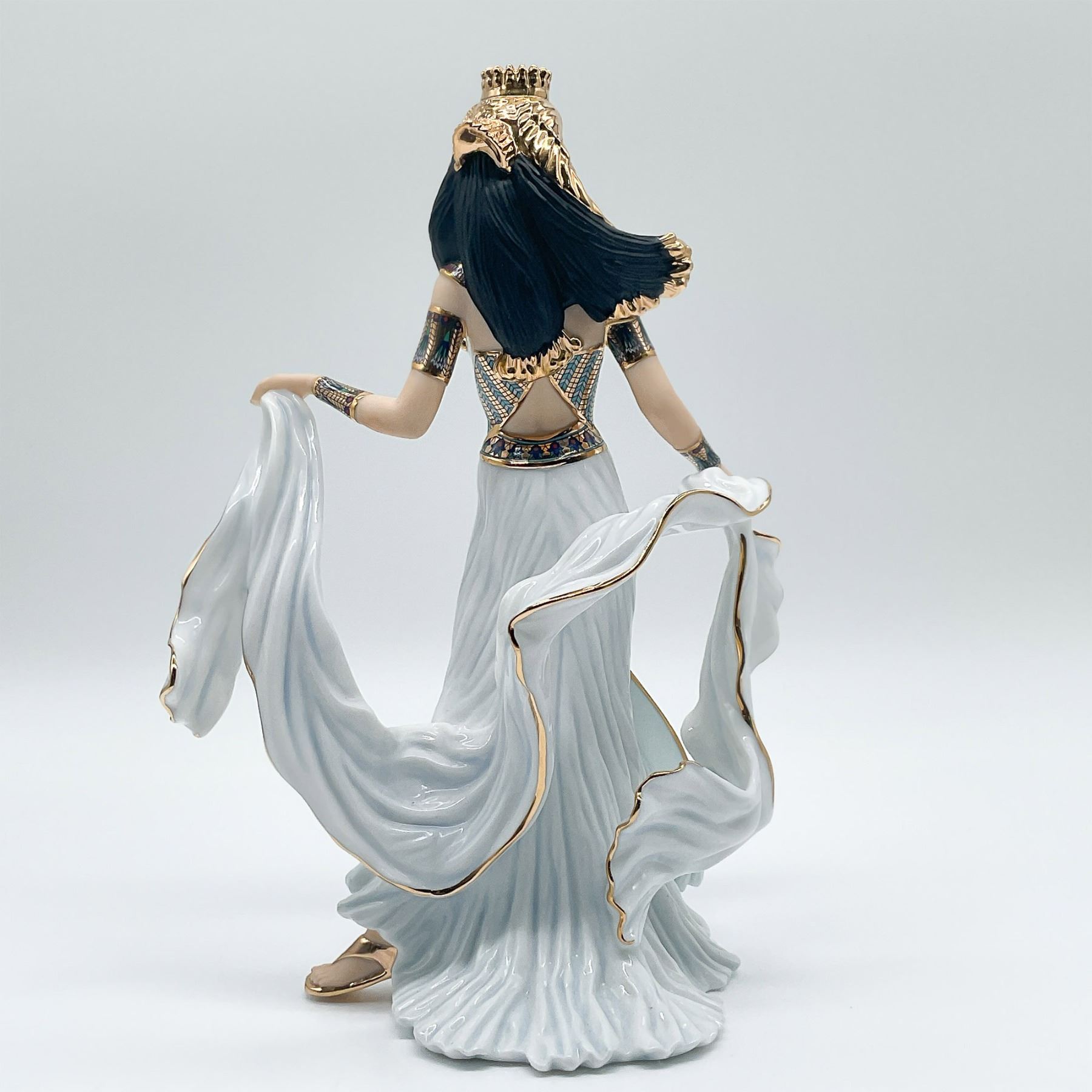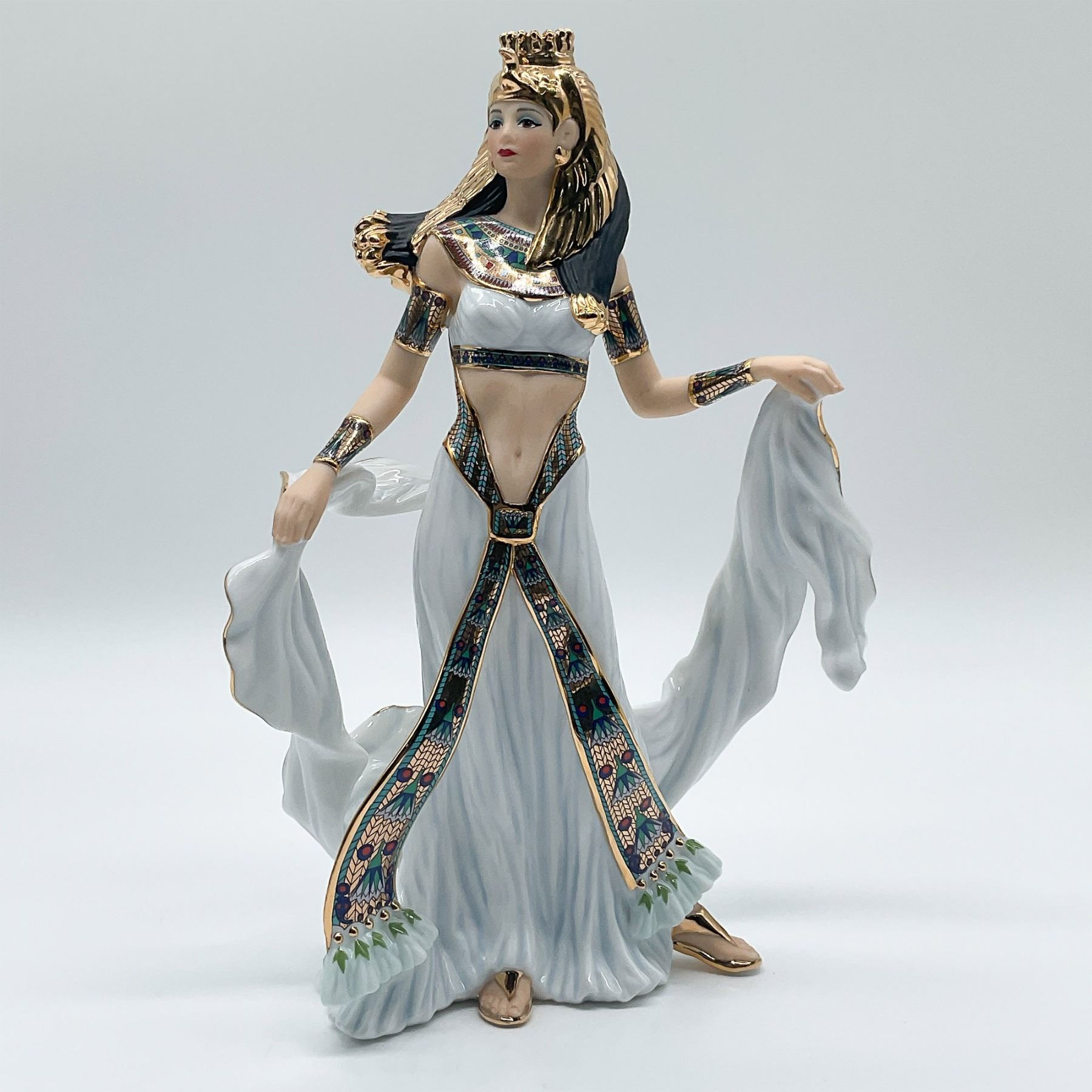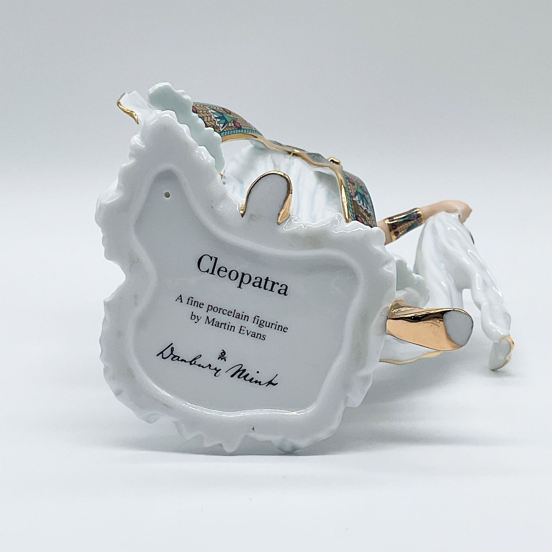 This exquisite porcelain figurine by the Danbury Mint depicts Cleopatra, intricately designed by artist Martin Evans. A masterpiece of craftsmanship, the figurine showcases Cleopatra adorned in a regal white gown with elaborate gold gilding and jewel-toned accents, emphasizing the grandeur of her Egyptian heritage. The detailing extends to her elegant pose, flowing gown. The base is marked “Cleopatra, A Fine Porcelain Figurine by Martin Evans, Danbury Mint,” ensuring authenticity. A collector's item that captures the essence of history and artistry.