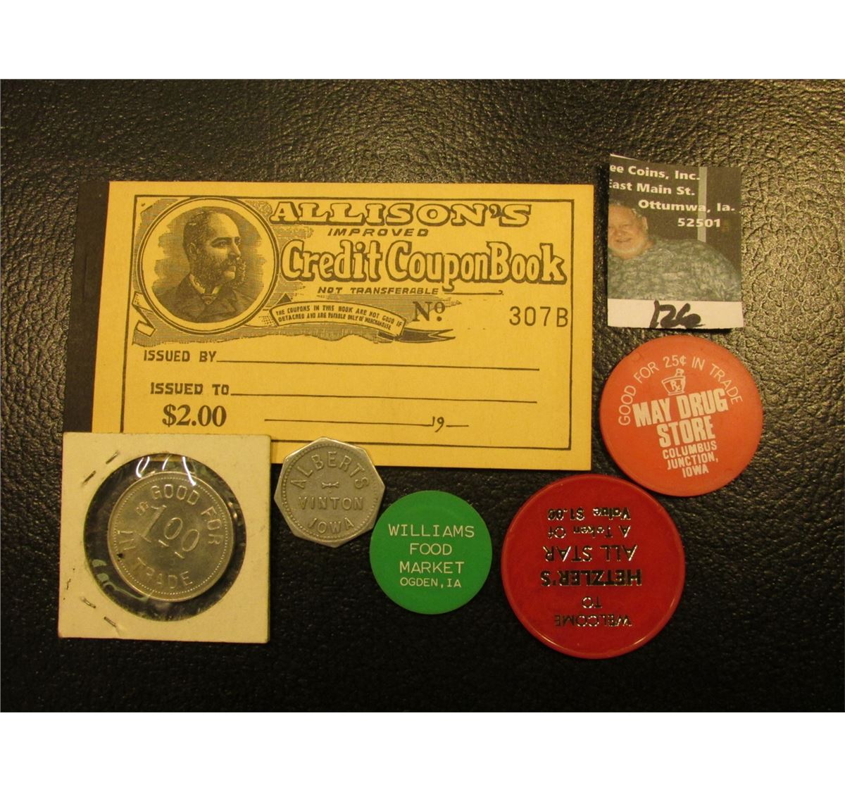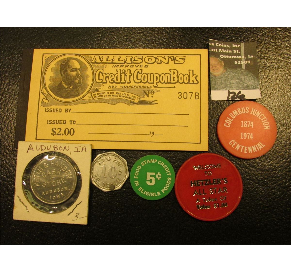 Mint condition Booklet "Allison's Improved Credit Coupon Book… $2.00"; & (5) different Iowa Good For Tokens including Ogden, Vinton, Columbus Junction, & Audubon, Ia.
