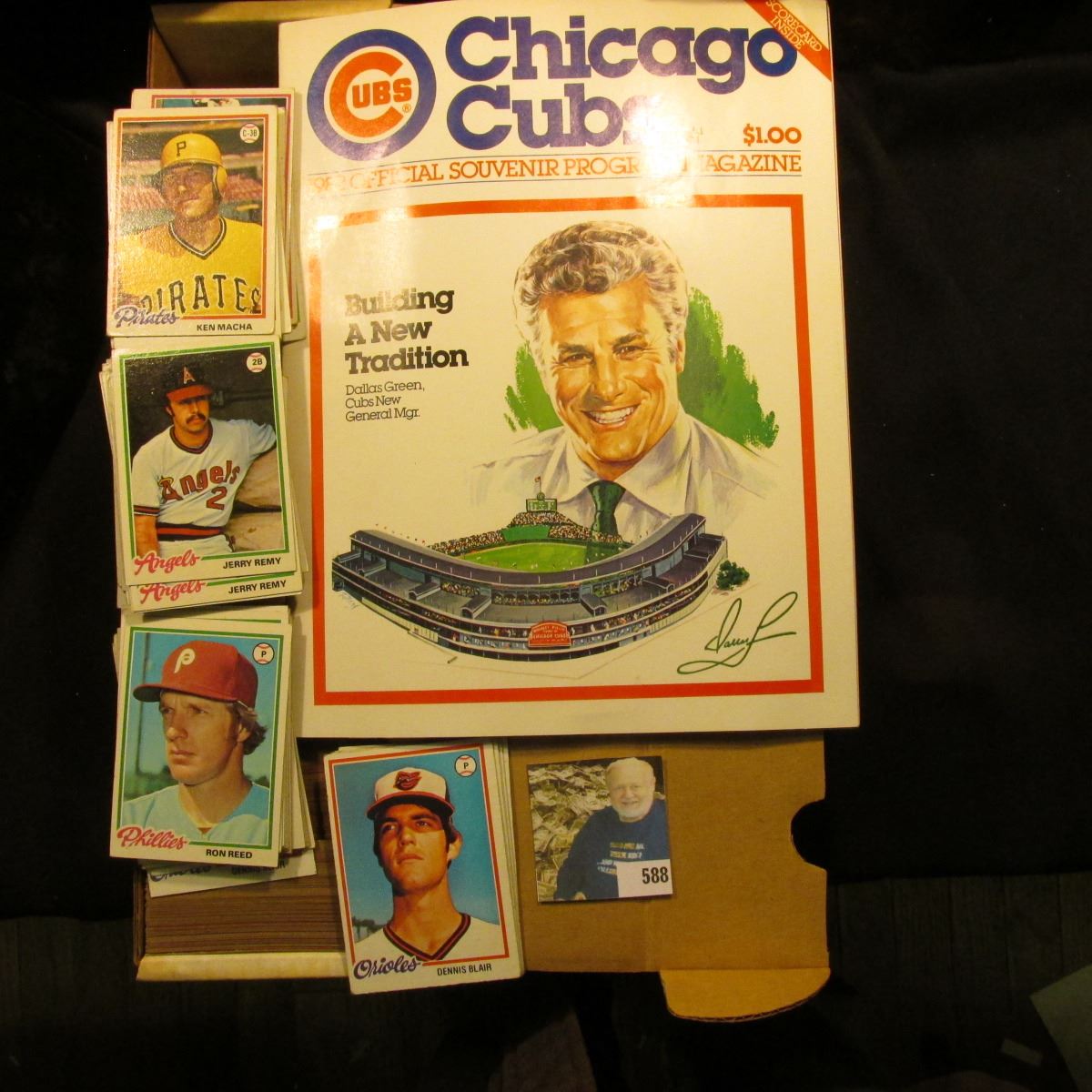Mint condition, Vol.1 No.1 "Chicago Cubs 1982 Official Souvenir Program Magazine"; & 14" Card Stock Box 90% full of 1978 Topps Baseball Cards