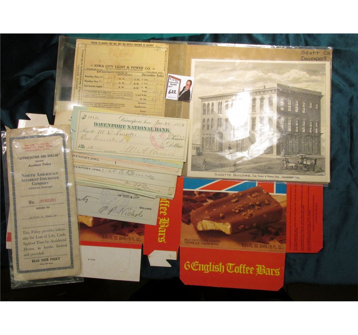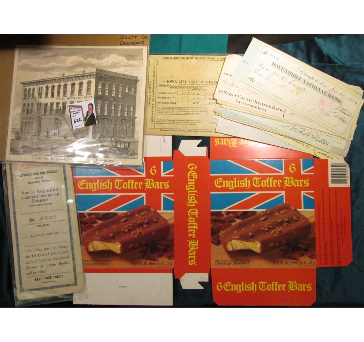 Mint condition, unfolded "English Toffee Bars" Box; "Young Men's Christian Association Gazette Building…Davenport, Iowa" 1875 Woodcut Print (from book?); early "North American Accident Insurance Company" policy; 1922 "Iowa City Light & Power Co." Invoice; & (27) 1886-1919 era Checks from various banks in the Davenport, Iowa area.
