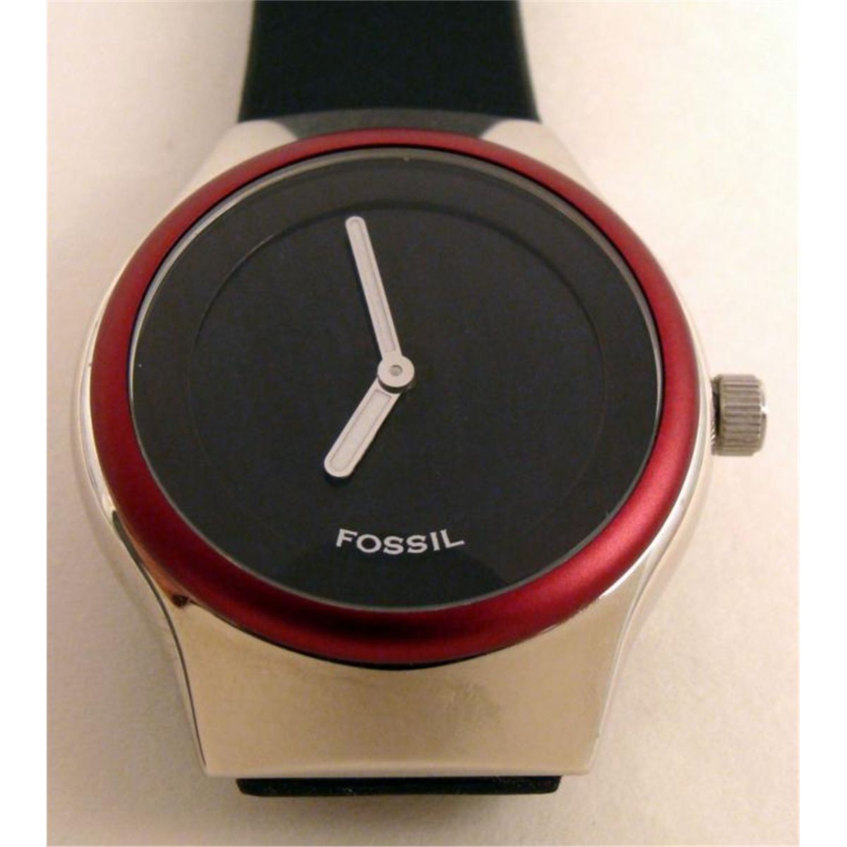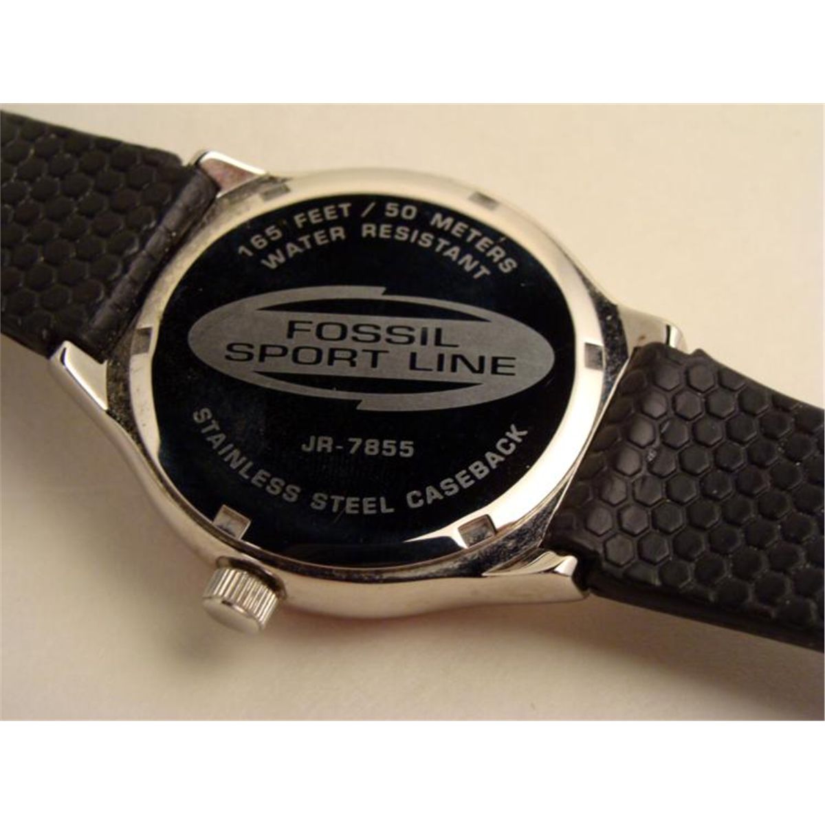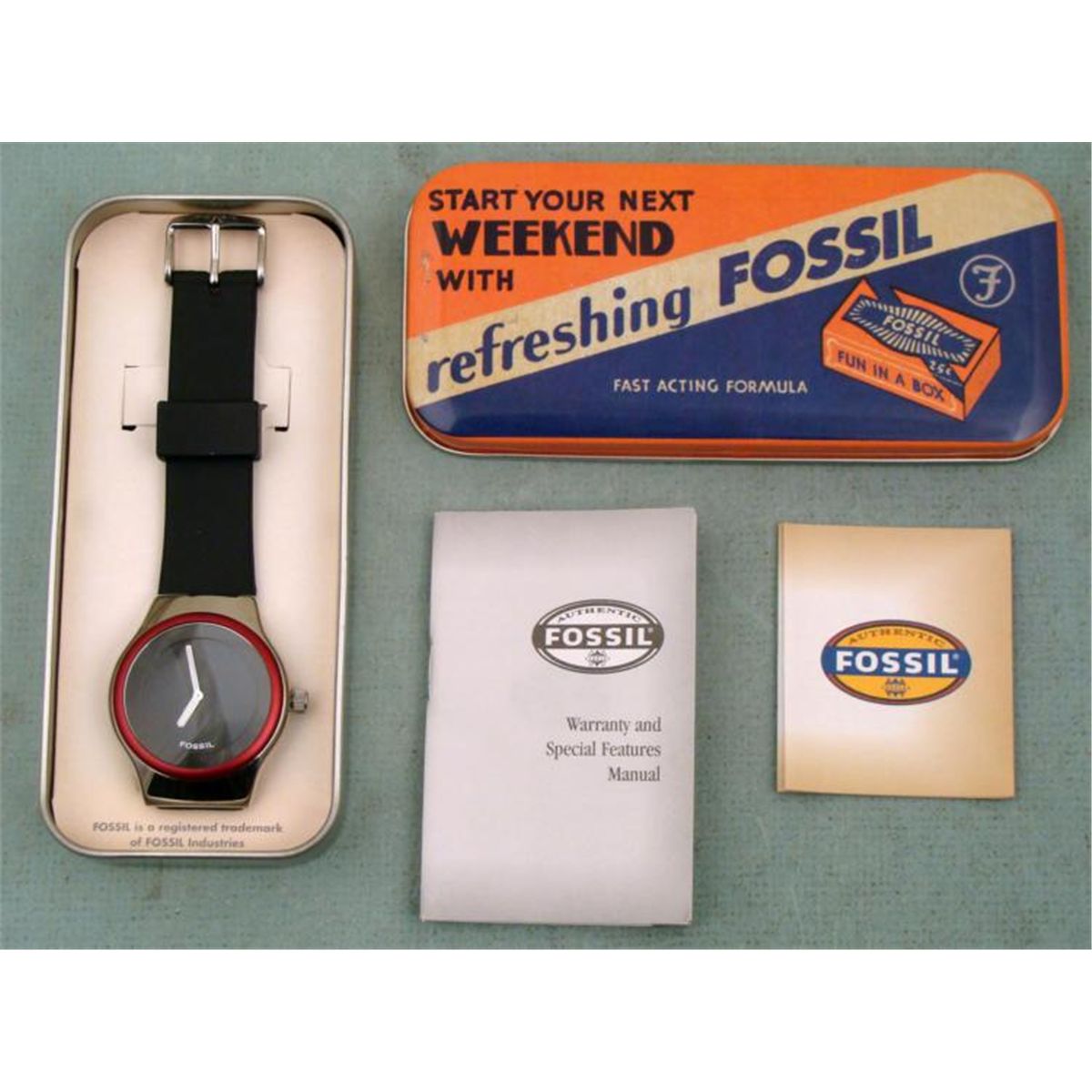 Offered here is an Original Fossil Classic mens wristwatch. The watch comes in its original tin box and is at least ten years old. * Model Number: JR-7855 * Dial: Black with white hour and minute hands * Case: Chrome-tone with cranberry red bezel, stainless steel case backWater Resistant to 50 metersBand/Size: Black rubber, will fit a wrist up to 7" aroundDate: 1998 * Condition: Never been worn * Included: Special featured instruction manual and warranty booklet