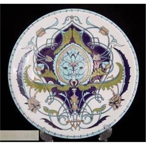 </font></strong>Minton Porcelain Art Nouveau Cabinet plate Enamelled In Blue Green And Orange With Stylized Flowers And Leafage 1870 (Slight Factory Chip On Rim Glazed Over) (China) (Also See Cabinet Plates, Plaques,Chargers, Unframed Plaques.Commemorative Ware.)