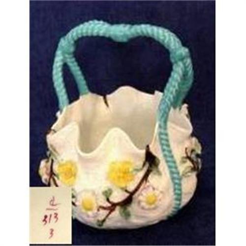 Minton Basket Embossed Flowers on a White Ground, Turquoise Handle (Petal Damage To One Flower)