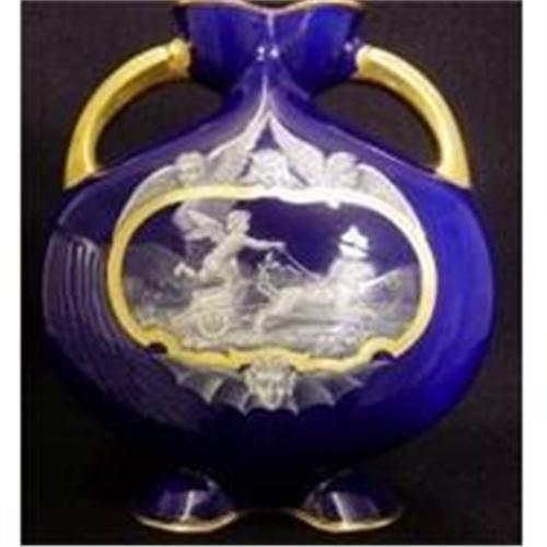 Minton China Vase Decorated in French White limoges Enamels on a Dark Blue Glaze Ground Two Lions Pulling A Charriot With A Cherub Signed By Thomas John Bott (Fairy) (Fairies) (Putty) (Cupid) Extremely Rare