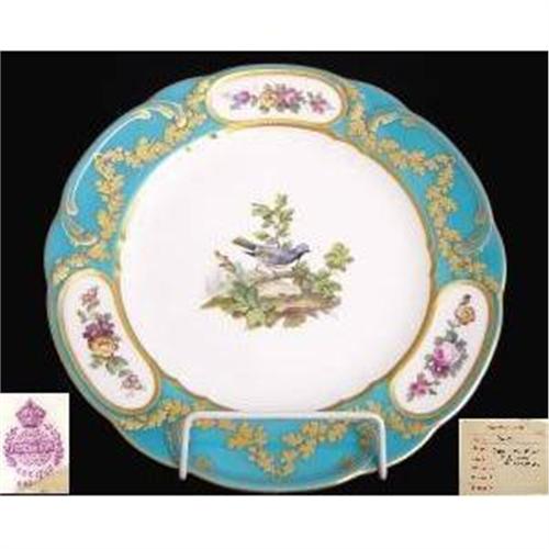 Minton Dessert Plate Originally From Queen Victorias Dinner Service From Doultons Museum Rare c1890 The Centre Hand Painted Enamel Of A Bird On A Tree Branch The Rim Turquoise With Inset Hand Painted Enamels Of Flowers And Raised Paste Gilding Pattern No. OA.66