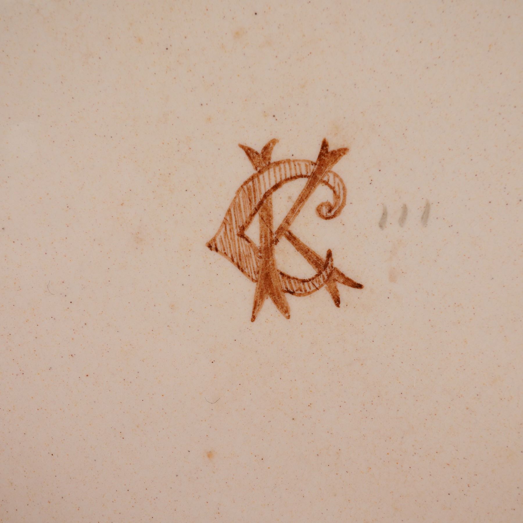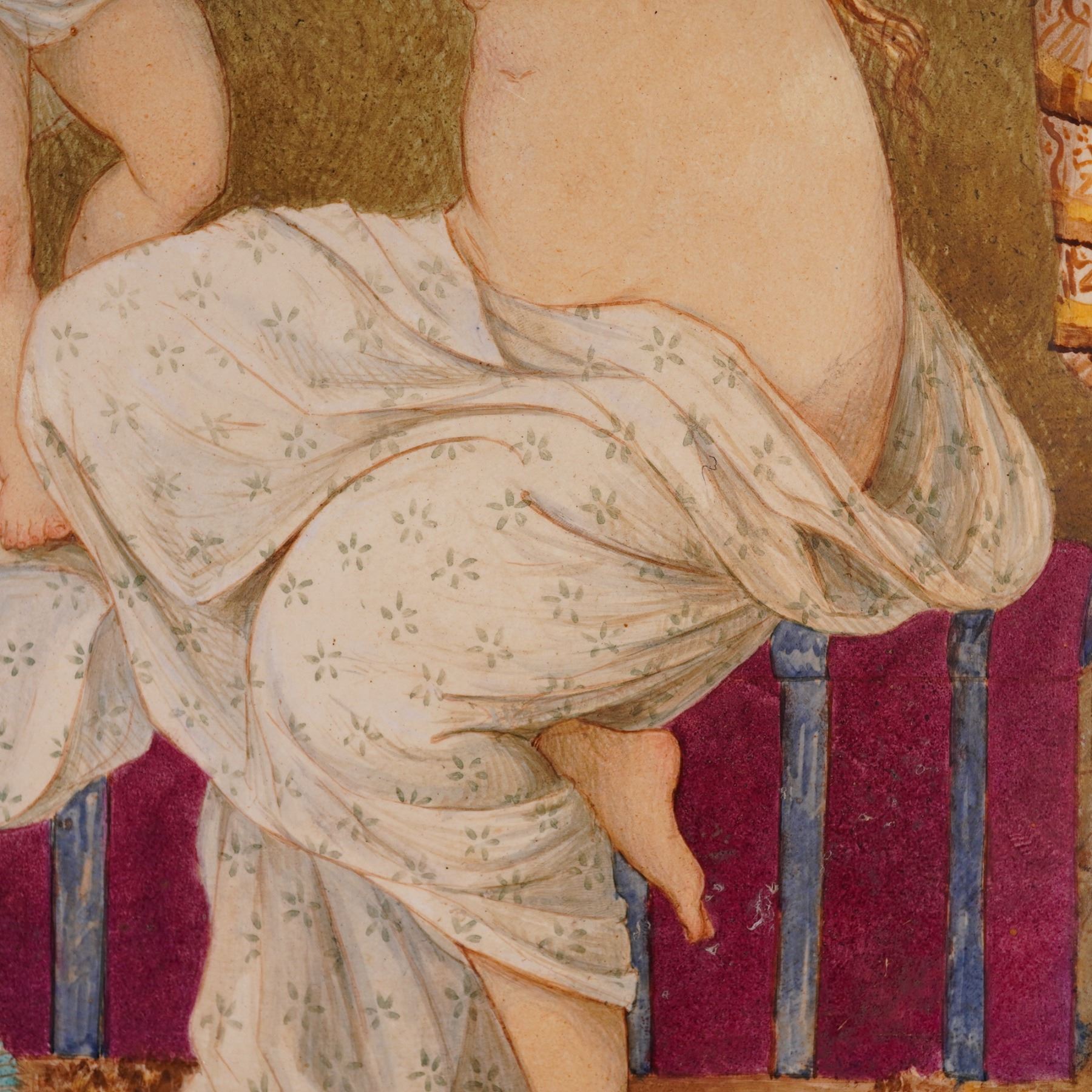 Hand painted, large earthenware wall charger decorated with a classical scene depicting a seated nude woman kissing a cherub on the cheek. Set on a stylized, daylight scene in warm hues of brown, blue, green, burgundy, and white. Minton impressed backstamp.