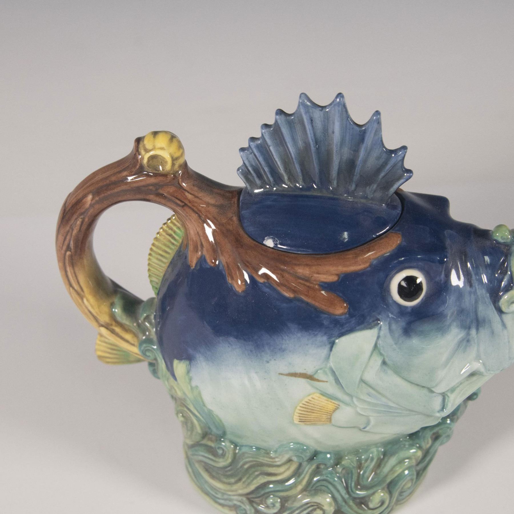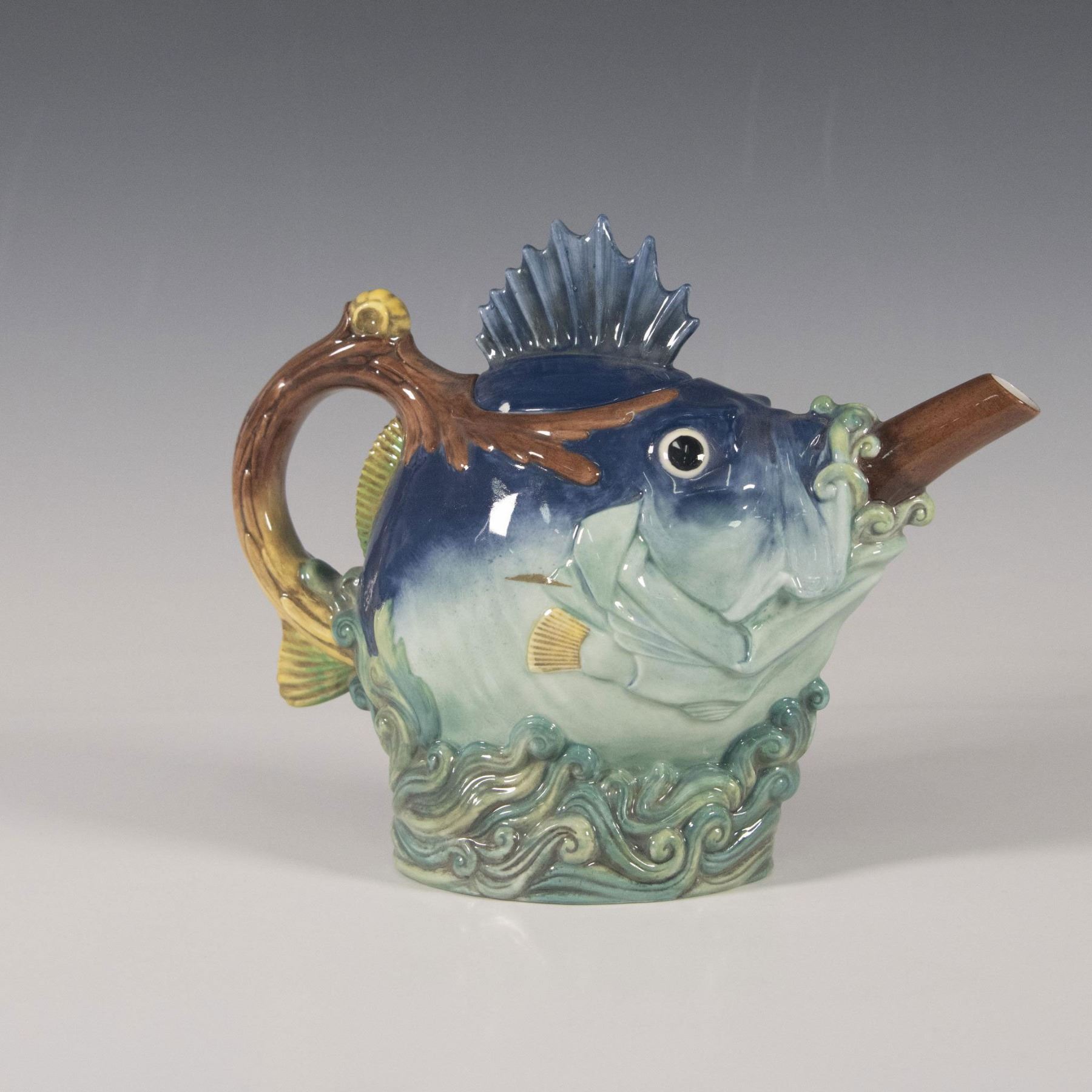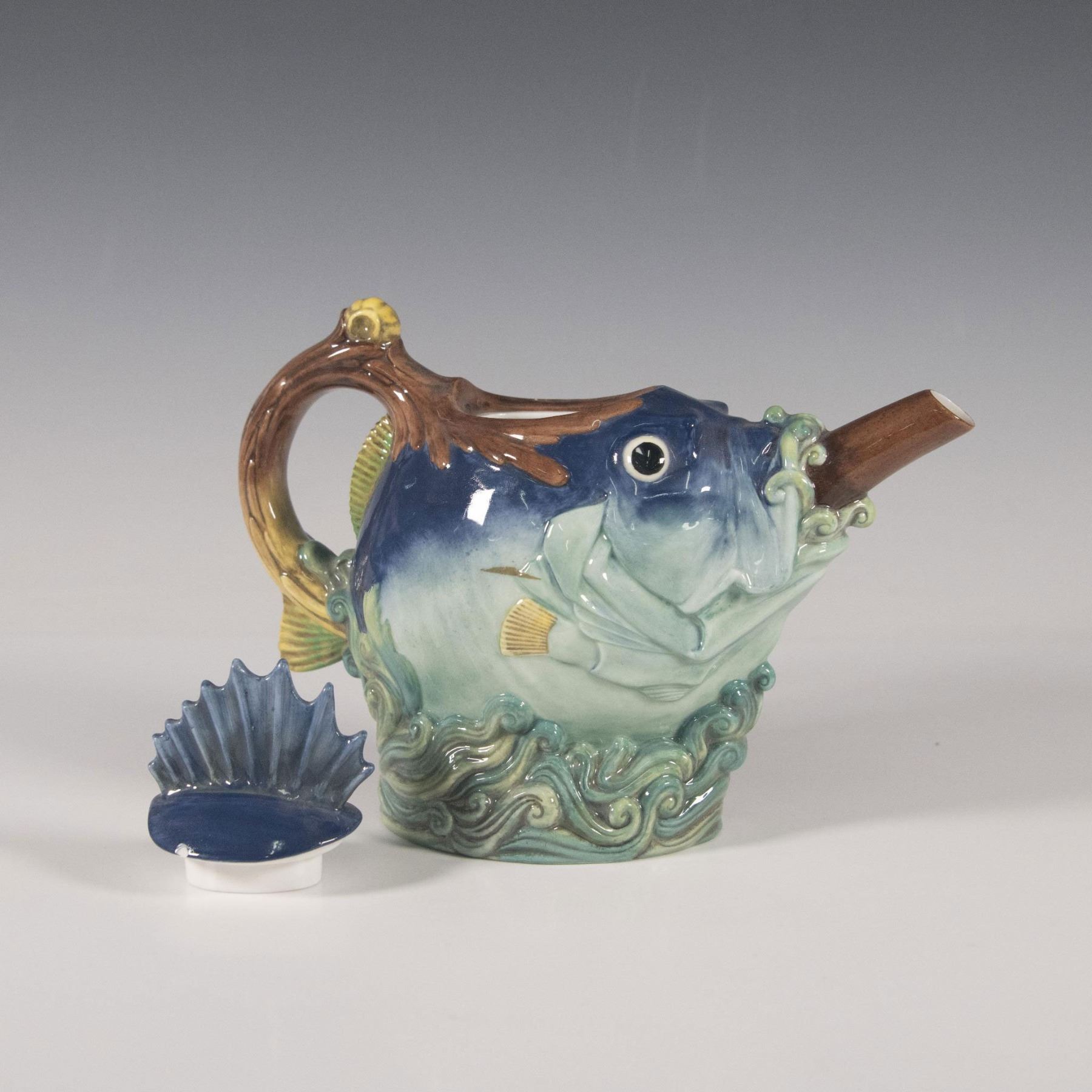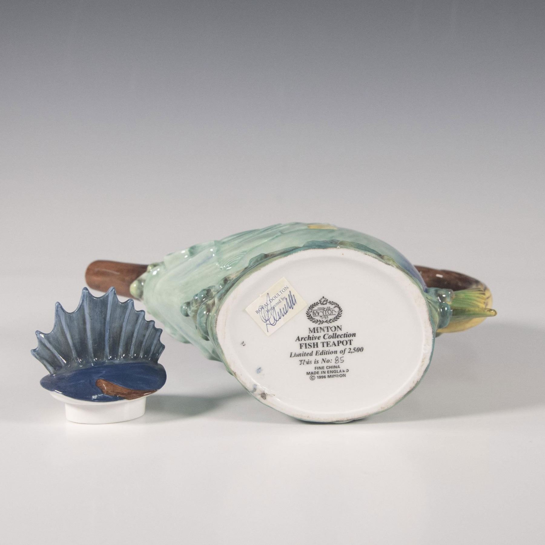 Limited edition figural cafe pot depicted as a fish. Made for Minton Archive Collection. The fin of the fish forms the lid. Minton backstamp. This item has its original box: 10.75"L x 9.5"W x 4.25"H. Certificate of Authenticity included. Issued: 1996