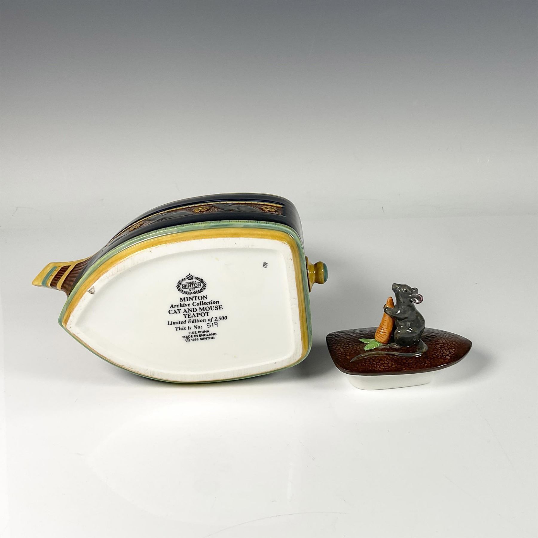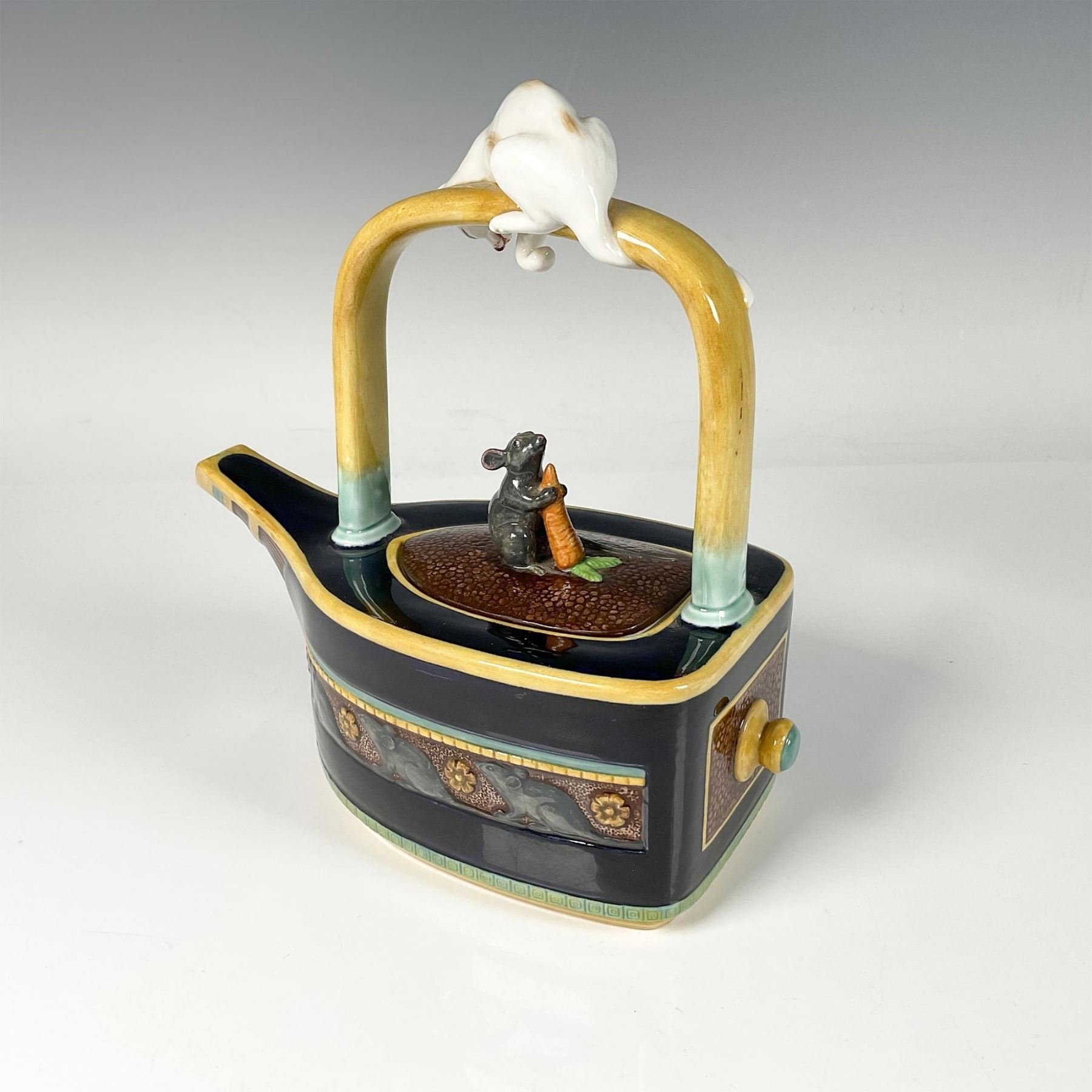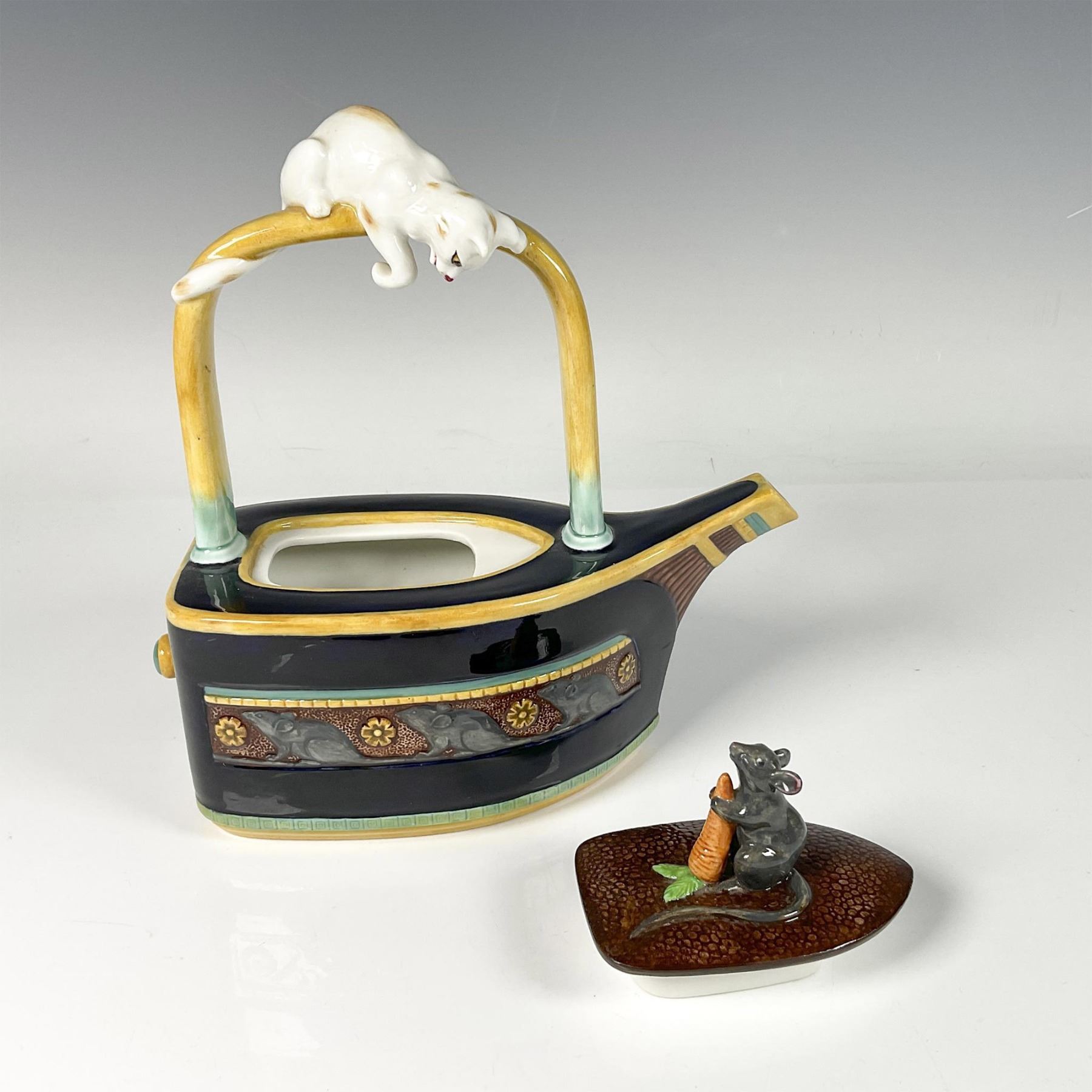Limited edition teapot in a classic boat shape, featuring a removable lid adorned with a frieze of a mouse holding a carrot, while a cat looks down at the mouse on the handle. Limited edition numbered and Minton Archive Collection backstamp.