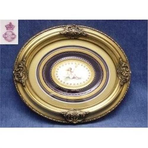 Minton Framed Miniature Oval Plaque By Anton Boullemier Of A Cherub Enamelled 1877 With A Gilded Colbalt Blue Border. (Puttys) (Fairies) (Cupid) (Cherubs)