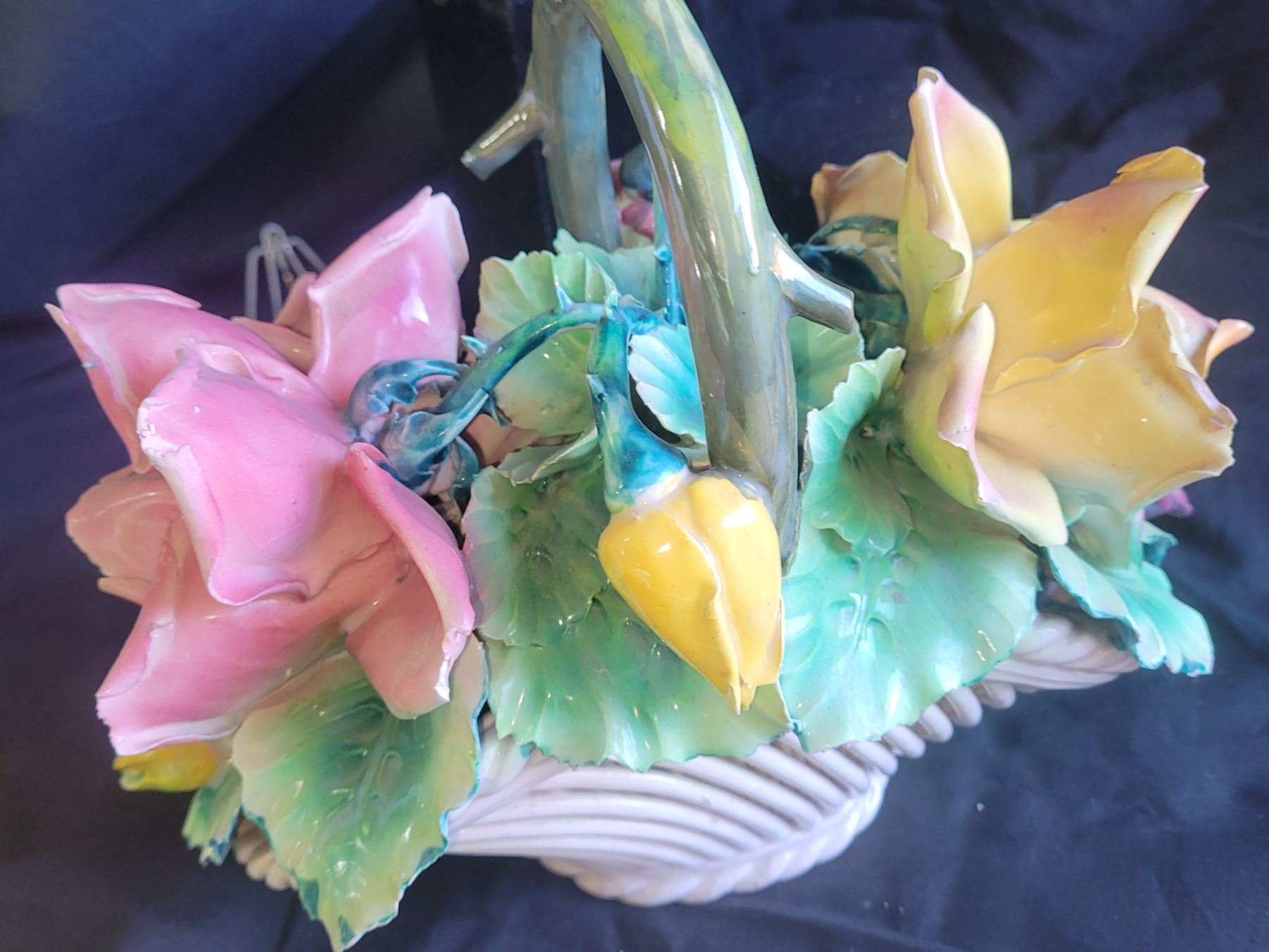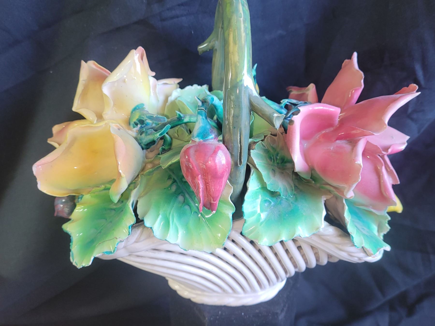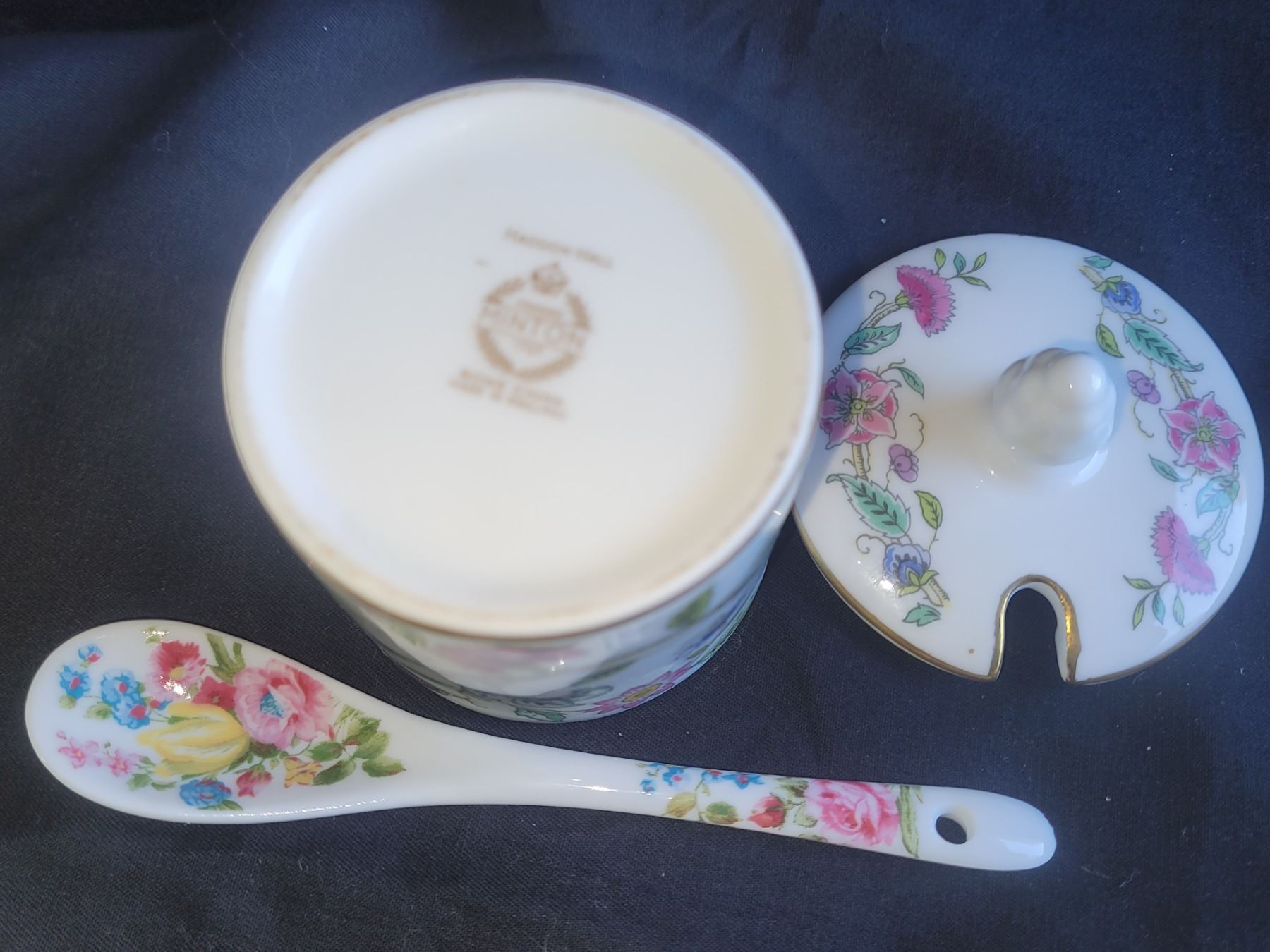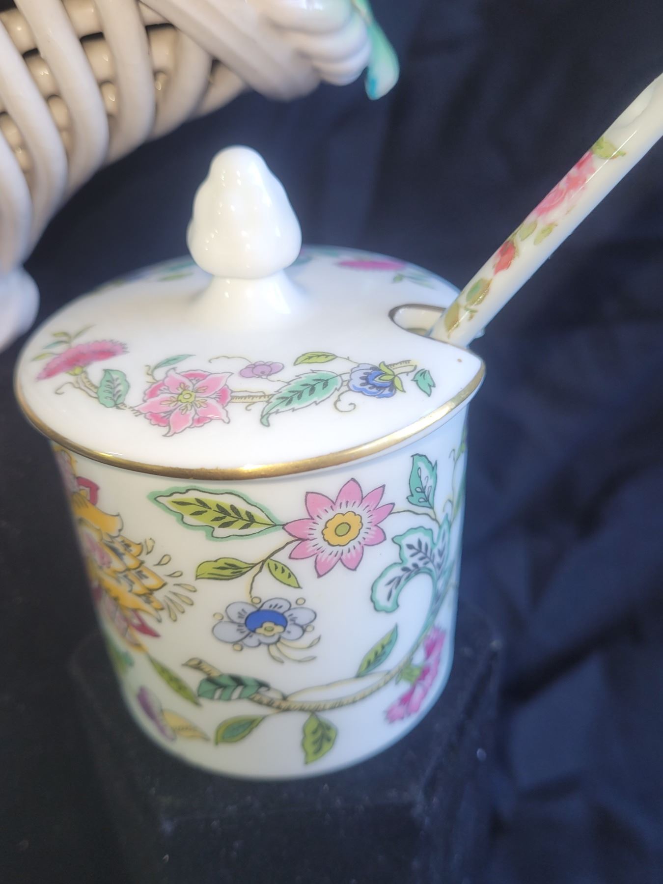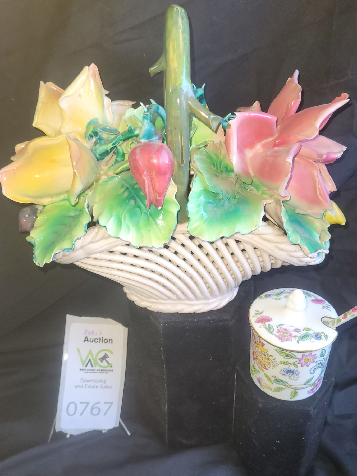 Italian porcelain flower basket, note petals have chips 11x8x5. Minton preserve or sugar pot with spoon. Pickup at 9 am