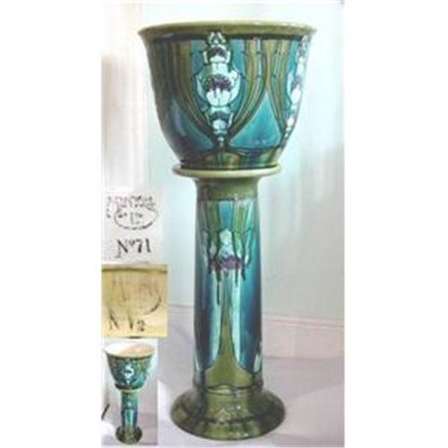 Minton Secessionist Jardinere And Stand Tubelined With A Stylised Floral Design In Green And Purple On A Turquoise Ground Black Printed Mark And Number 71 And 72 To Base c 1905