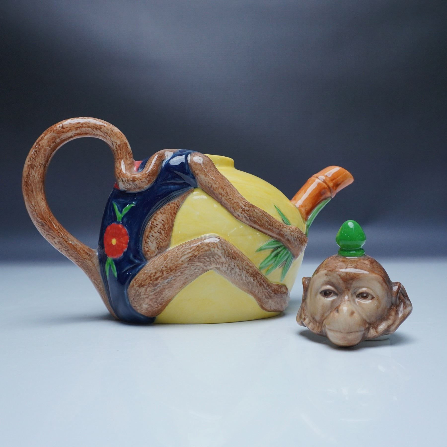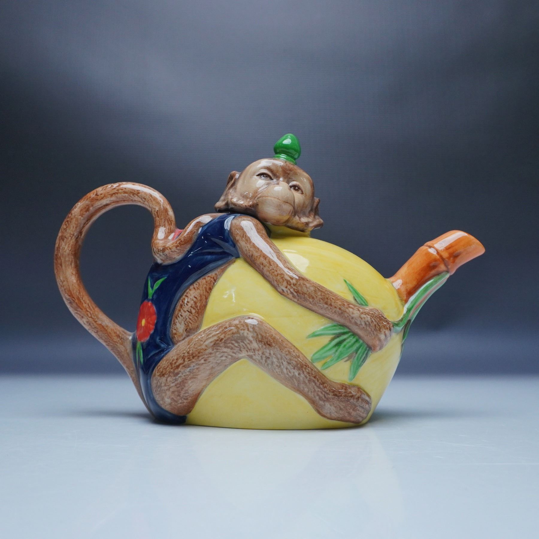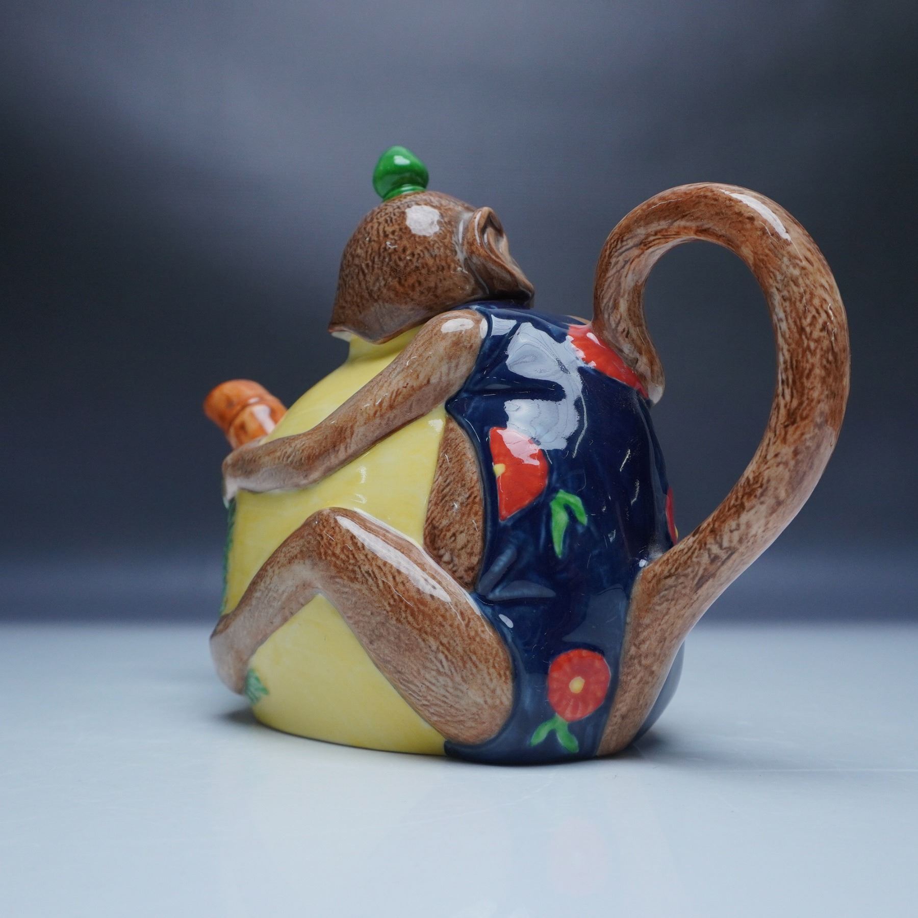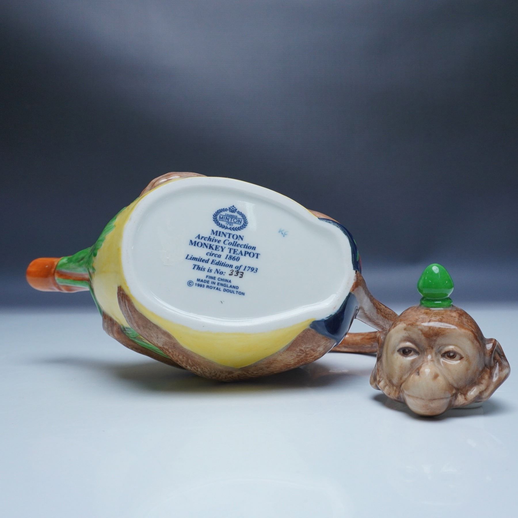 This Minton fine china Monkey Teapot is a whimsical and highly collectible piece from the Minton Archive Collection, originally designed in 1860 and reissued as a limited edition of 1793. This particular teapot is number 333 in the series. The vibrant hand-painted design features a monkey clinging to a yellow teapot, with a removable monkey head lid topped with a green finial. The intricate detailing includes a sculpted tail forming the handle and tropical floral accents. Measuring 5.75"H, this charming figurine is a fine example of Minton’s craftsmanship, made in England in 1993 under Royal Doulton.