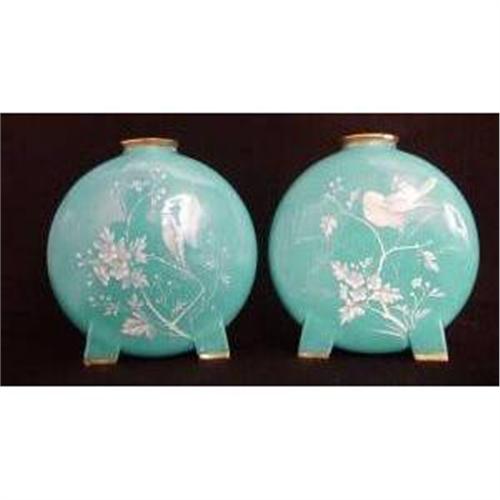 Minton Moon Flasks Enamelled Birds and Flowers on a Turquoise Ground, Gilded Rim and Feet ( Some Damage to Both Rims )
