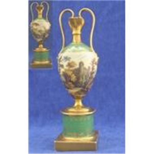 Minton Gilt Two Handled Double Lipped Ovoid Pembroke Vase With Square Based Circular Pedestal Foot c 1830 With Green Base And Shoulder Over Decorated With Gilt Scrolling Leafage Enclosing A Finely Decorated Body Painted With A Continuous Wooded mountainous River Landscape Scene Set with A Castle, House And Figure Crossing A Bridge. (Slight Repair To Rim And Slight Rub To Base.)
