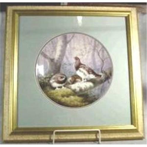 Framed Minton Porcelain Cabinet Plate, All-Over Painted By A.Wright, With Ptarmigans,Signed and Dated 1918,Gilt Rim (9.5 Ins Diameter) (China)