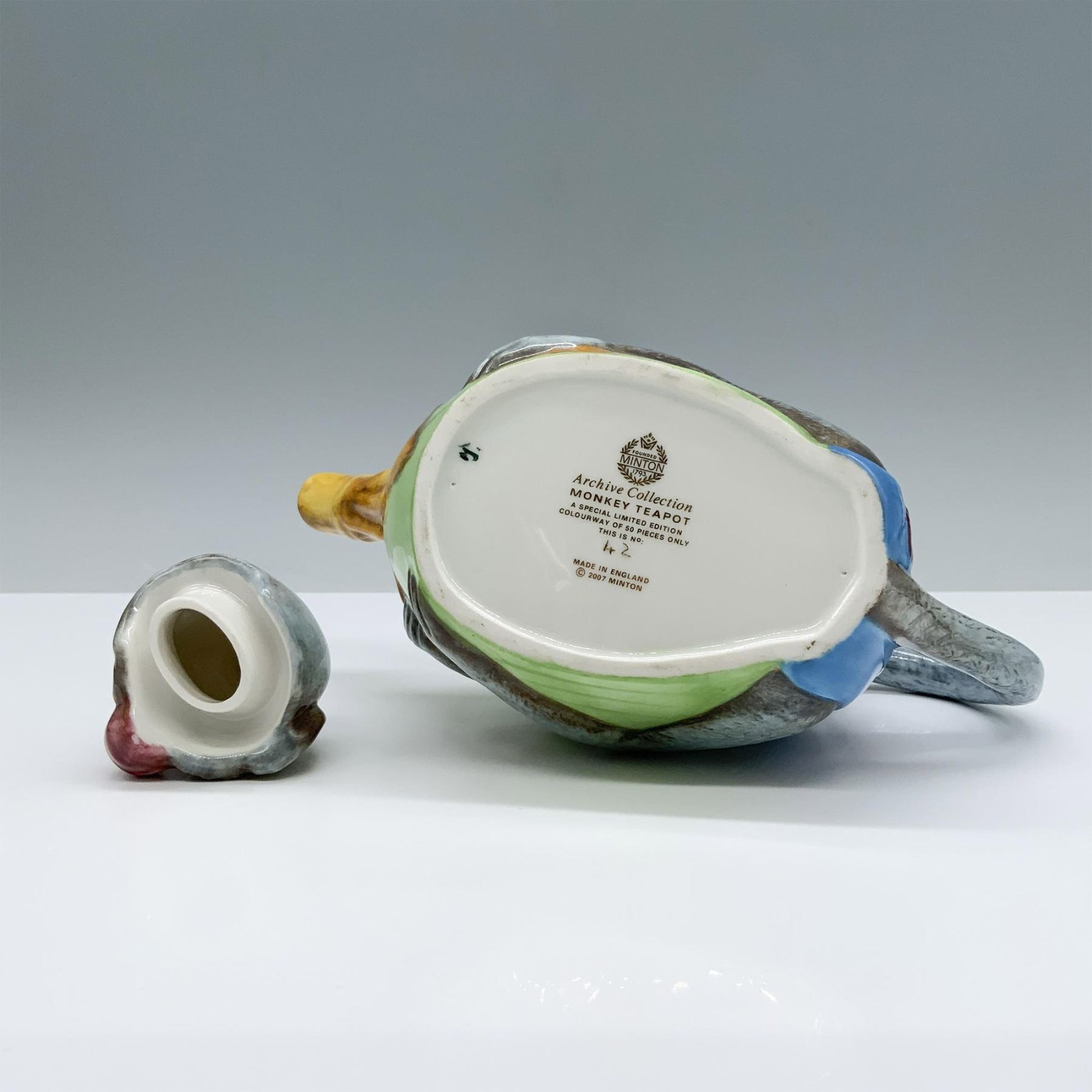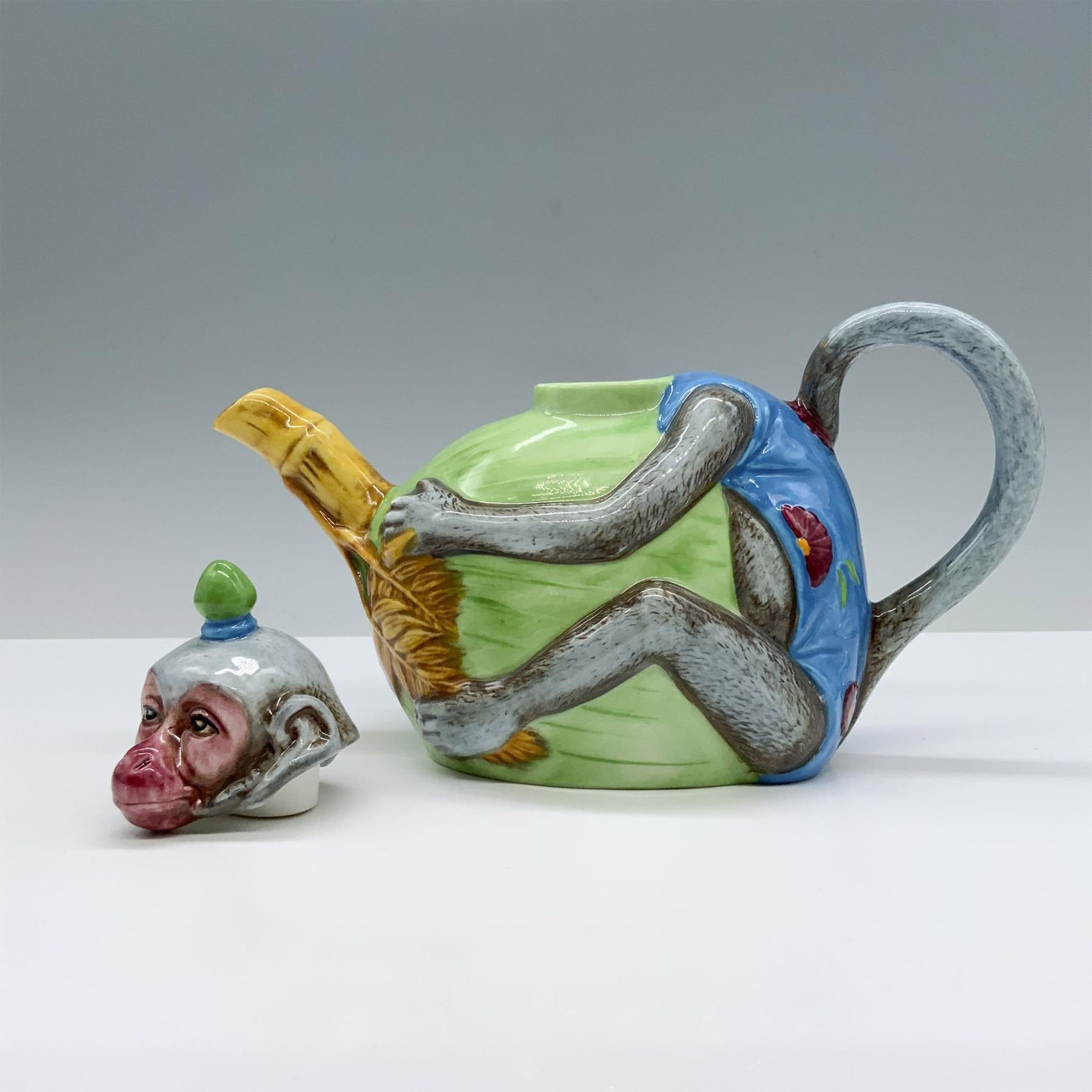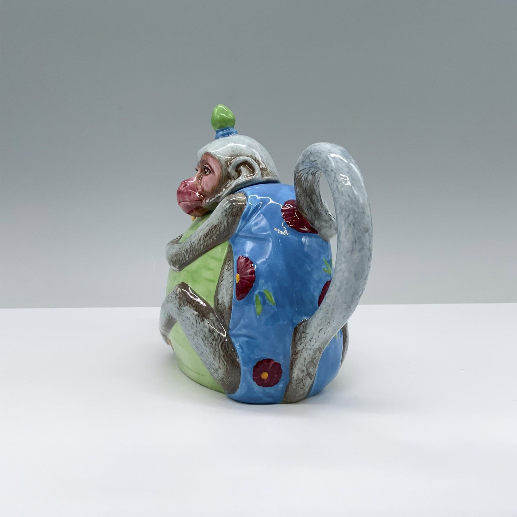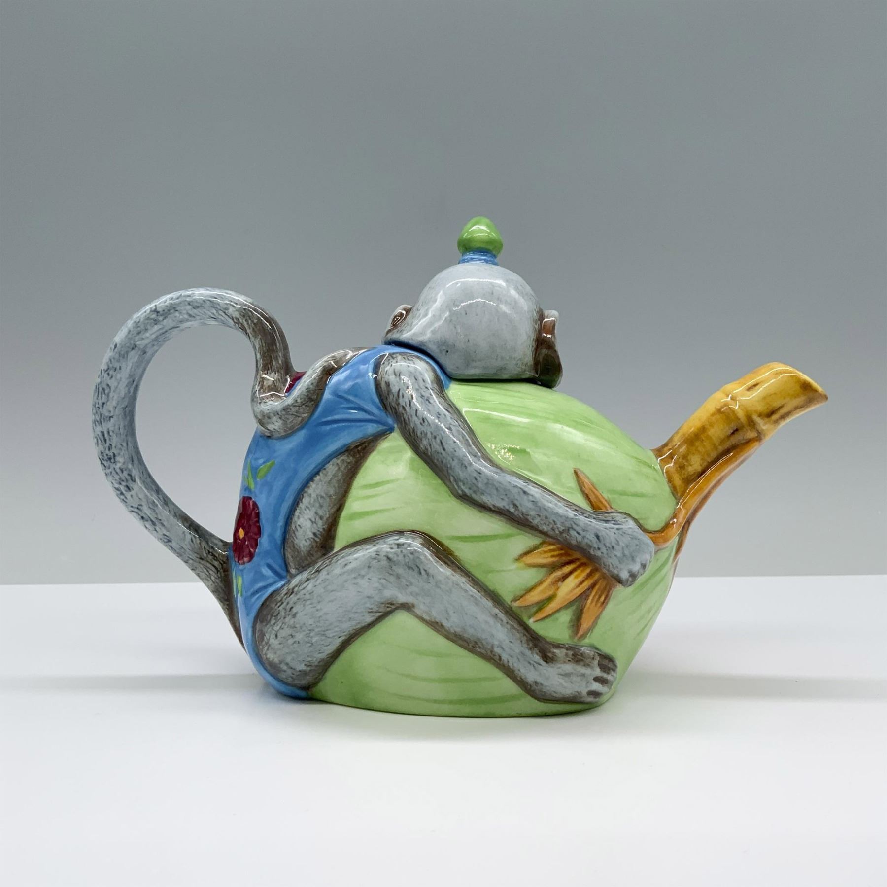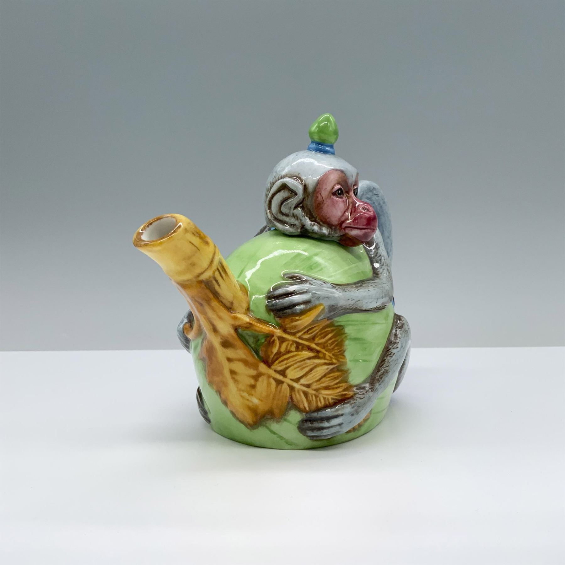 Hand painted limited edition porcelain featuring a dressed monkey with blue and red accents, holding a green fruit that forms the main body of the tea spot and spout. Archive Collection. Milton backstamp.