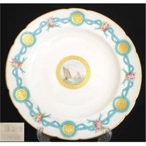 </font></strong>Minton Bleu Celeste Ribbon Cabinet Plate The Central Reserved Panel Handpainted With A Shipping Scene,Raised Gilt Fleu-De-Lys Border Roundels Interspersed With Roses c1862