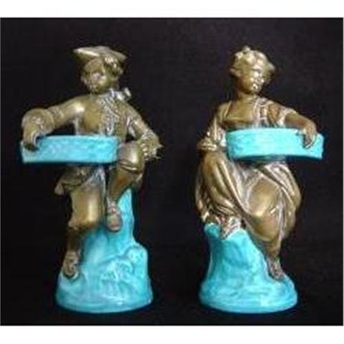 Minton Porcelain Figural Sweetmeat Dishes Modelled as a Bronzed Girl & Boy in 18th Century Dress Dated 1876 (China)