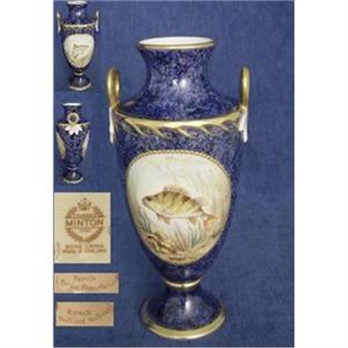 <p> Minton Twin Handled Footed Vase Painted With Fish Signed By The Artist A. Holland c1951 Dark Blue With Gilding And Gilded Handles The Front And Back Of The Vase Is Painted With Fish A Perch And A Roach.
