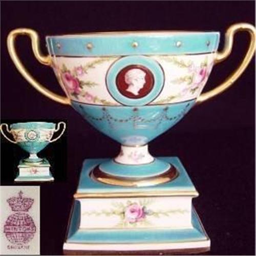 Minton Two Handled Hand Painted Vase And Stand c1891 Painted With Roses On A Turquoise Ground Gilt Embelished With Gilt Handles