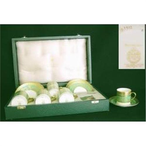 Minton Coffee Set For Six From The Realms Of Gold Sutherland Green (Leather Presentation Case) c1990 Decorated On Sutherland Green With 22 Carat Gold.