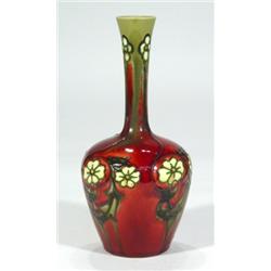 Mintons Successionist bottle vase, relief moulded and hand painted with a band of stylised flowers onto a red ground, printed marks to base and numbered 33, 20cm high