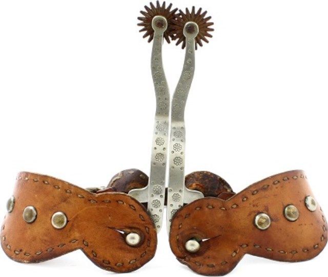 in Daisy pattern with 3" shanks, 1 1/4" rowels. Includes unmarked 2 piece leather straps. Est. 350-600