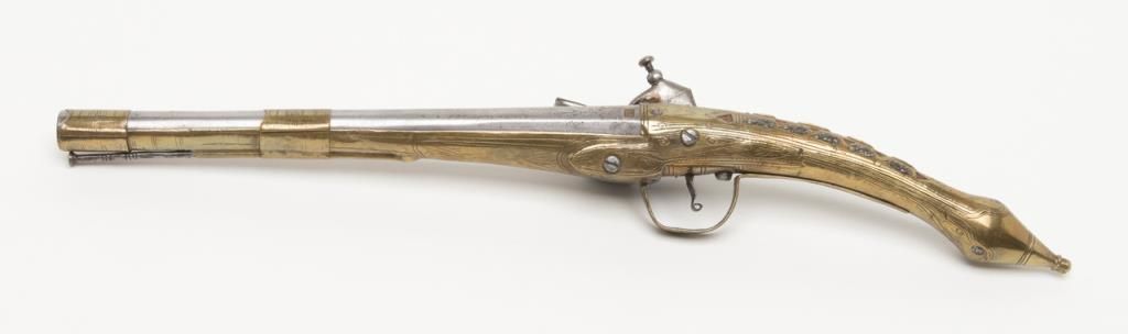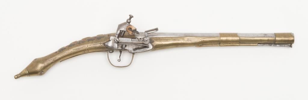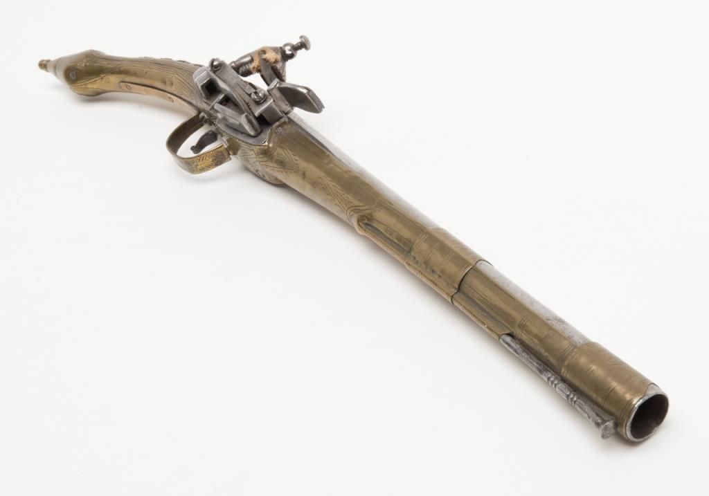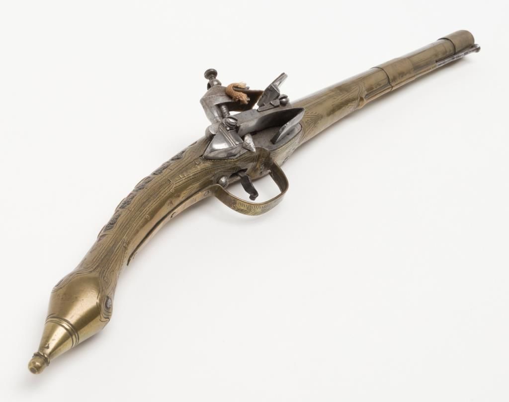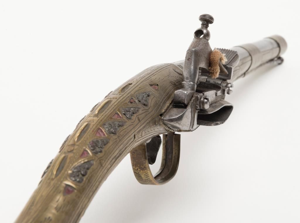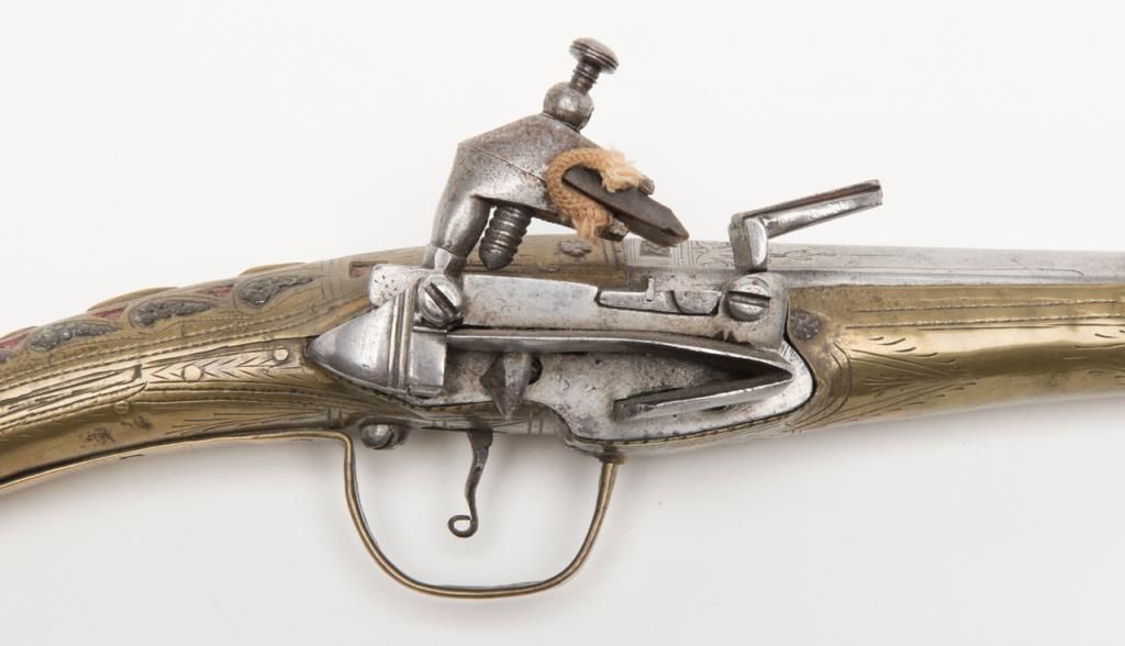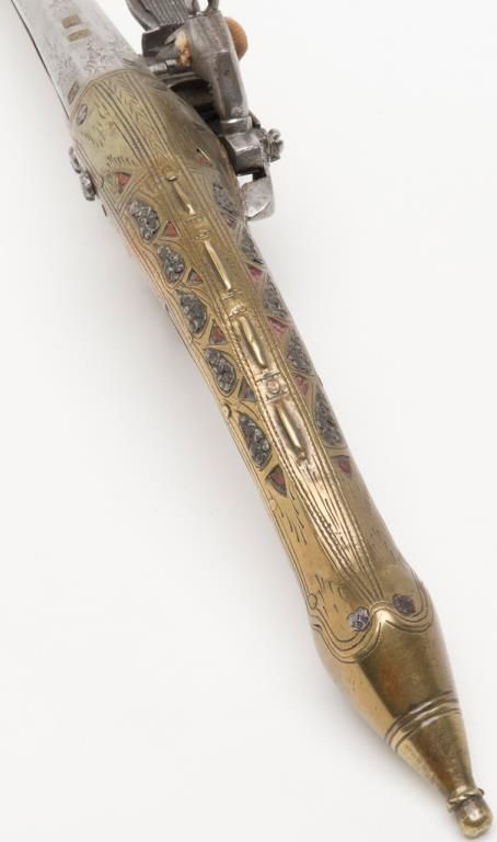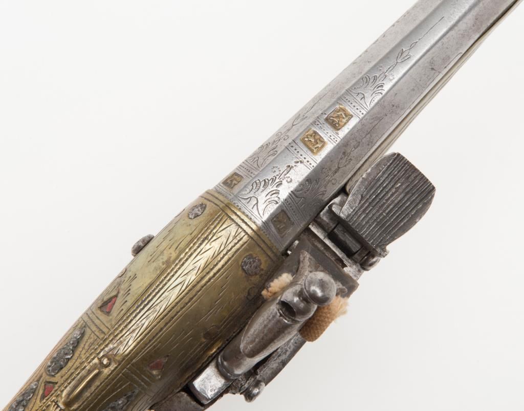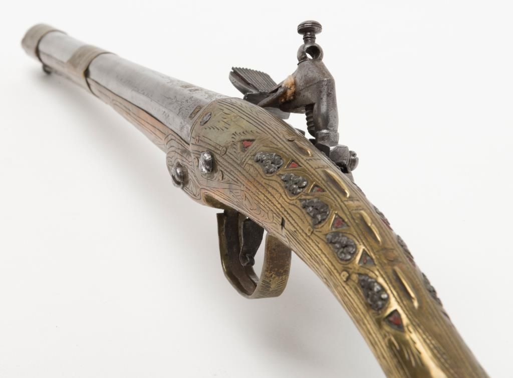 Miquelet Flintlock pistol, approximately .67 caliber. The pistol is in overall very good condition with an 11” barrel and overall length of 20 ½”. The pistol is mounted in brass with crude engraving and inlay. The barrel has been cleaned at some point and has gone to a silvery patina. The back strap has a series of raised fins which resemble a dragons back. (Antique). Est.: $400-$800.