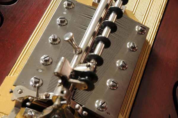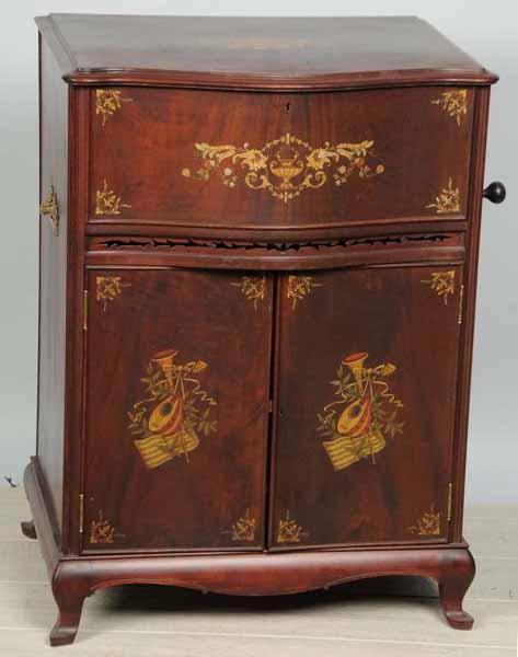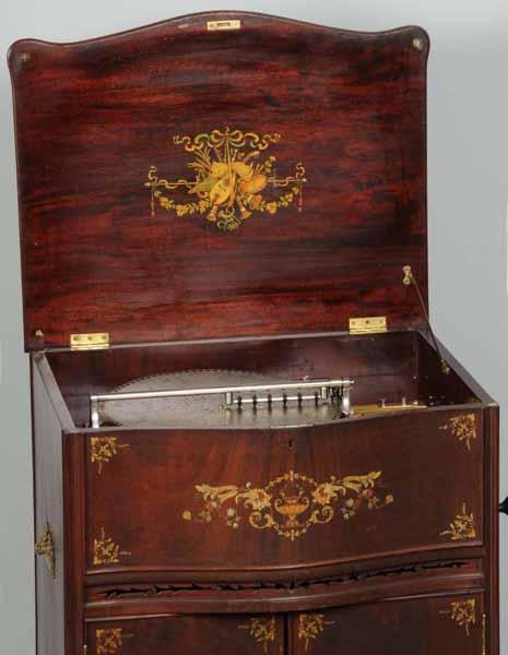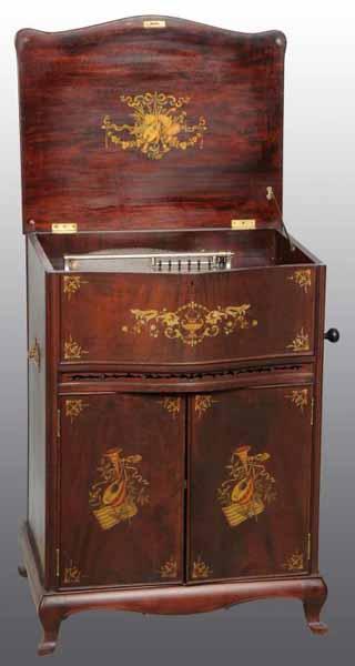 Description Console elaborate cabinet in mahogany. Includes 22 discs. Working. Condition (Good). Size 15 - 1/2".