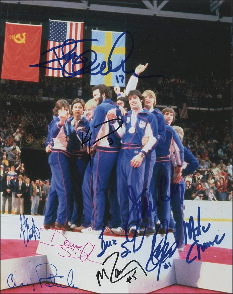 Color glossy 8 x 10 photo of the 1980 US Olympic hockey team celebrating on the medal stand, signed in various color felt tip by Jack O’Callahan, Jim Craig, Mike Eruzione, Ken Morrow, Steve Cristoff, Dave Silk, Craig Patrick, Mike Ramsey, Buzz Schneider, and Steve Janaszak. In fine condition.