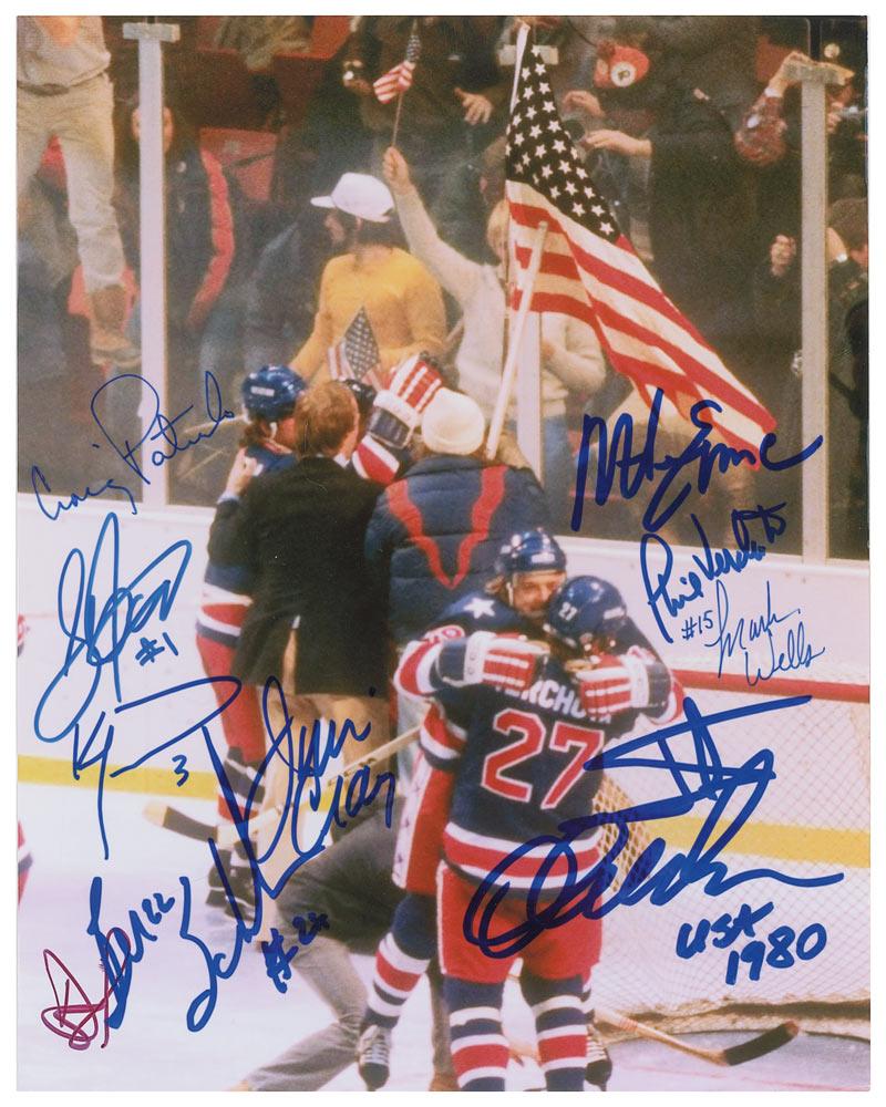 Emotional color glossy 8 x 10 photo of the US hockey team celebrating their victory, signed in blue and black felt tip by Dave Silk, Buzz Schneider, Jim Craig, Ken Morrow, Steve Janaszak, Craig Patrick, Mike Eruzione, Phil Verchota, Mark Wells, and Jack O’Callahan. In very fine condition.