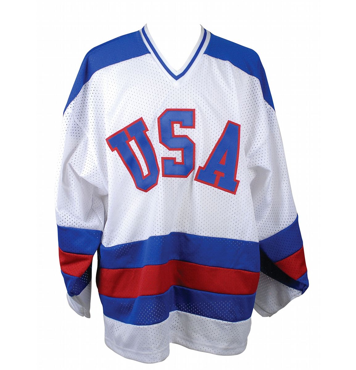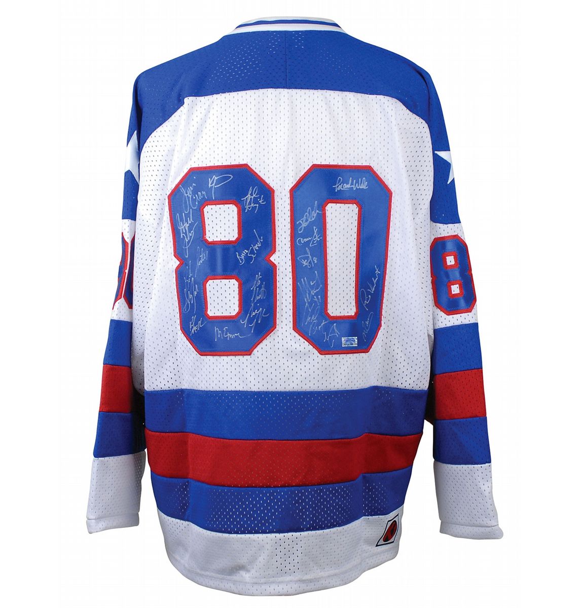 Replica Team USA Olympic hockey jersey, with sewn on letters and numbers, signed in silver ink on the number on the back by all 20 members of the legendary team, including: Mike Eruzione, Jim Craig, Dave Silk, Steve Christoff, Bill Baker, John Harrington, Buzz Schneider, Steve Janaszak, Mike Ramsey, Jack O’Callahan, Dave Christian, Neal Broten, Mark Pavelich, Eric Strobel, Bob Suter, Rob McClanahan, Ken Morrow, Mark Johnson, Mark Wells, and Phil Verchota. In fine condition.