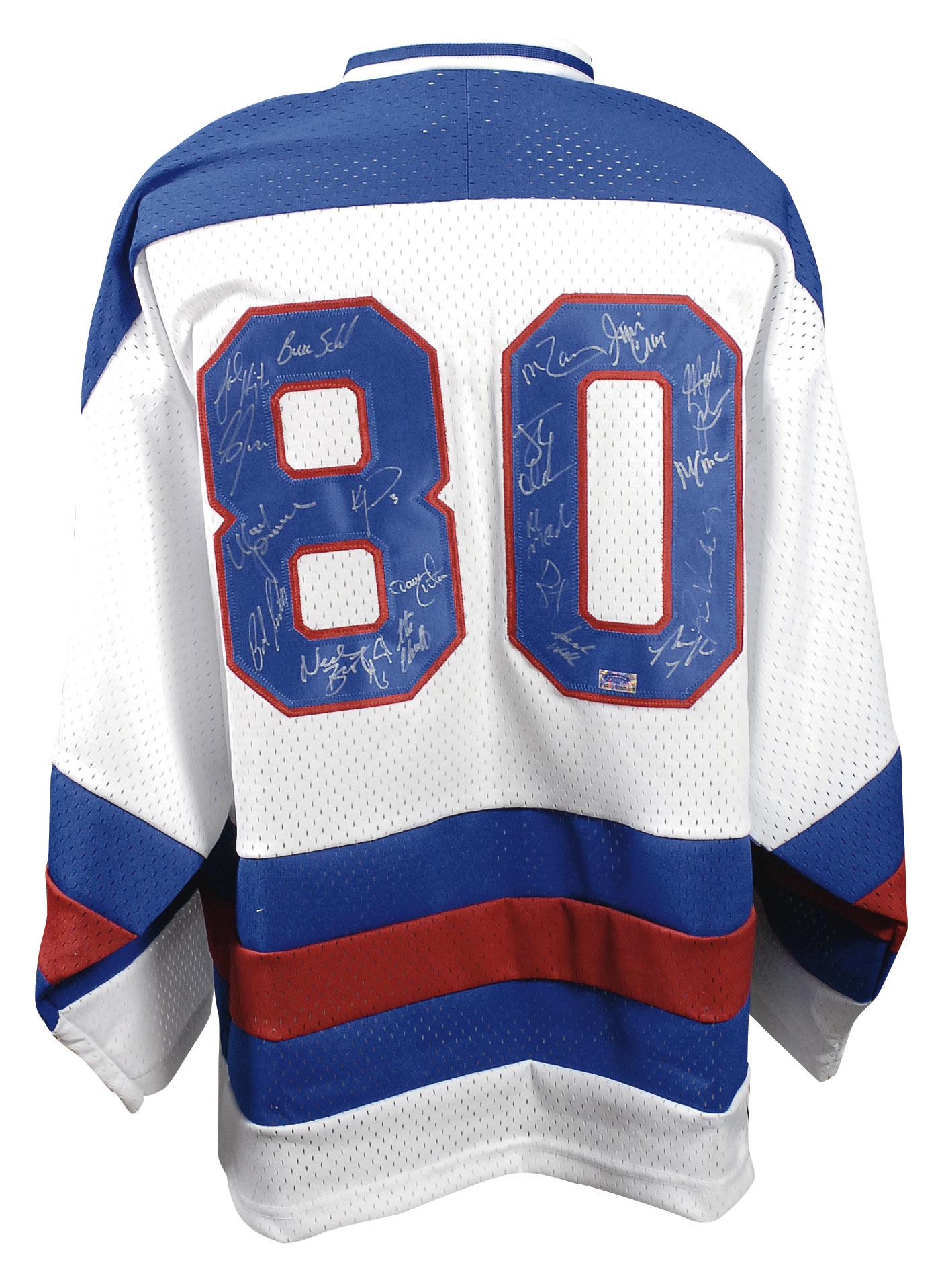 Official K1 replica Team USA hockey jersey, with sewn on letters and numbers, signed in silver ink on the number on the back by 20 team members: Mike Eruzione, Jim Craig, Dave Silk, Mark Wells, Steve Christoff, Bill Baker, John Harrington, Buzz Schneider, Steve Janaszak, Mike Ramsey, Jack O’Callahan, Dave Christian, Neal Broten, Mark Pavelich, Eric Strobel, Bob Suter, Rob McClanahan, Ken Morrow, Mark Johnson, and Phil Verchota. Accompanied by a composite photo of all the players taken at time of signing. In very fine condition. Pre-certified Steve Grad/PSA/DNA and RRAuction COA.
