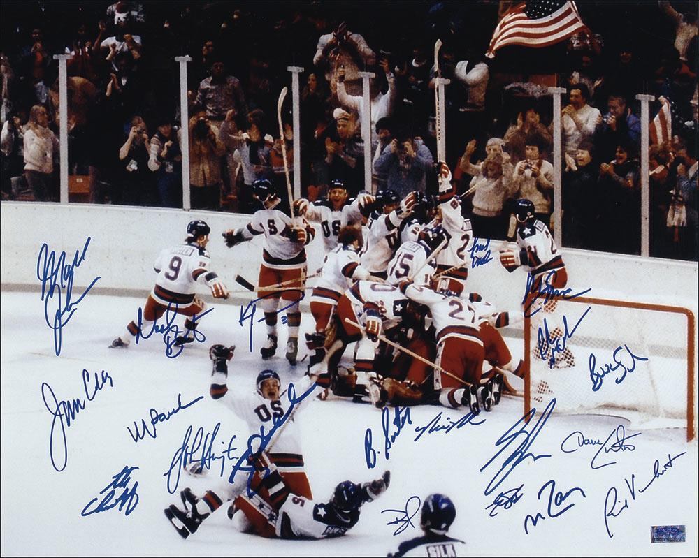 Color satin-finish 20 x 16 photo of the 1980 Olympic hockey team celebrating their final victory, signed in blue felt tip by all 20 members of the team: Mike Eruzione, Jim Craig, Dave Silk, Mark Wells, Steve Christoff, Bill Baker, John Harrington, Buzz Schneider, Steve Janaszak, Mike Ramsey, Jack O’Callahan, Dave Christian, Neal Broten, Mark Pavelich, Eric Strobel, Bob Suter, Rob McClanahan, Ken Morrow, Mark Johnson, and Phil Verchota. Accompanied by a composite photo of all the players taken at time of signing. In very fine condition. Pre-certified Steve Grad/PSA/DNA and RRAuction COA.