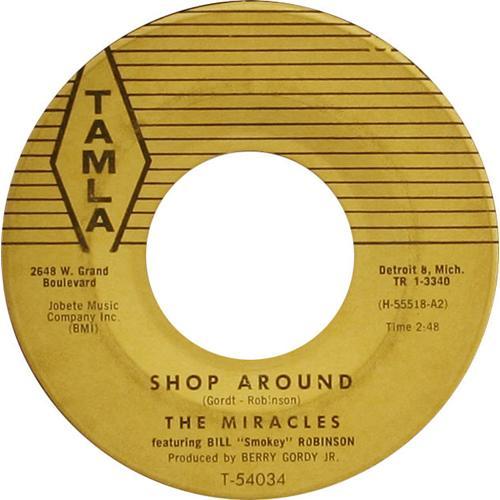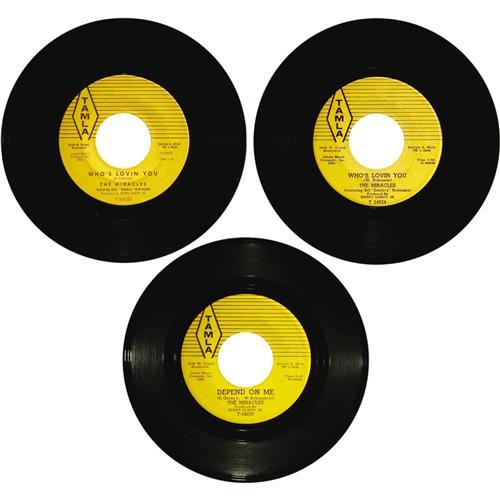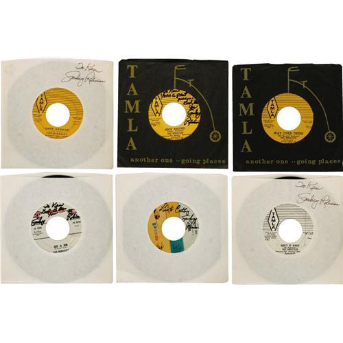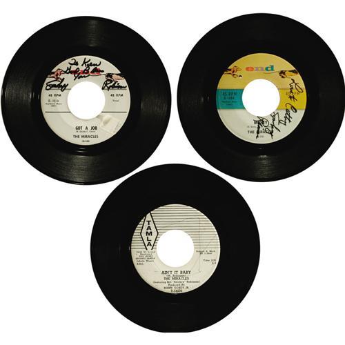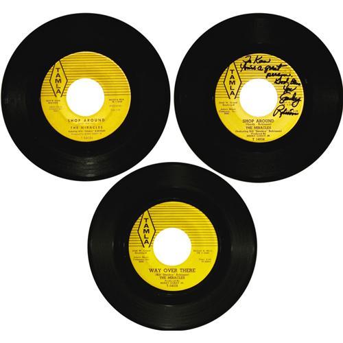 <B>Miracles 45 Group of 6 With 5 Smokey Robinson Autographs.</B></I> "Got A Job"/ "My Mama Done Told Me" (End 1016, 1958); "Money"/ "I Cry" (End 1084, 1958); 2 copies (one copy is the rare withdrawn version) of "Shop Around"/ "Who's Lovin You" (Tamla 54034, 1960); "Ain't It Baby"/ "The Only One I Love" (Promo Tamla 54036, 1961); and "Way Over There"/ "Depend On Me" (Tamla 54028, 1960) in EX 7. All but the latter have been autographed by the great Smokey Robinson on the record label or on the accompanying sleeve. All are in VG-EX 6 unless otherwise noted. <I>From the Rockin' Rev Collection</B></I>.<BR><BR><b>Shipping:</b> Recordings (<a target="_blank" href="http://www.heritageauctions.com/common/shipping.php">view shipping information</a>)