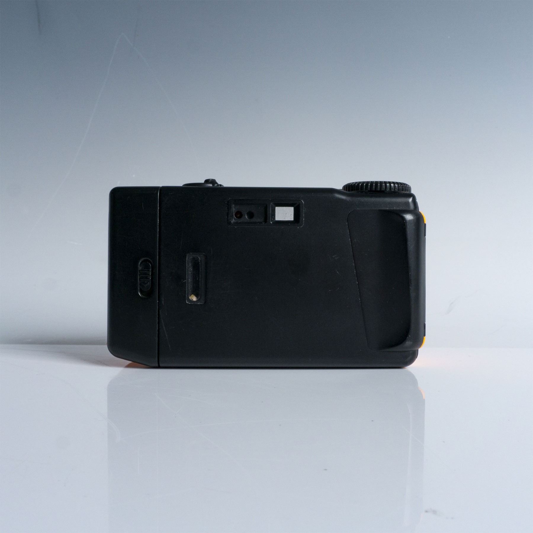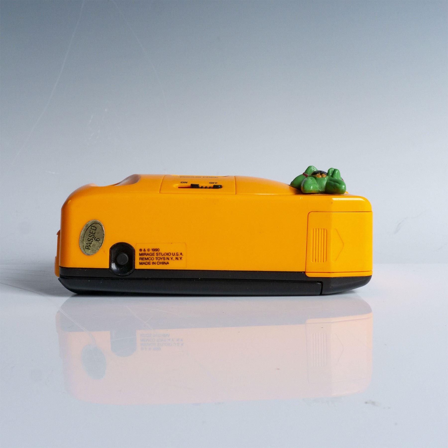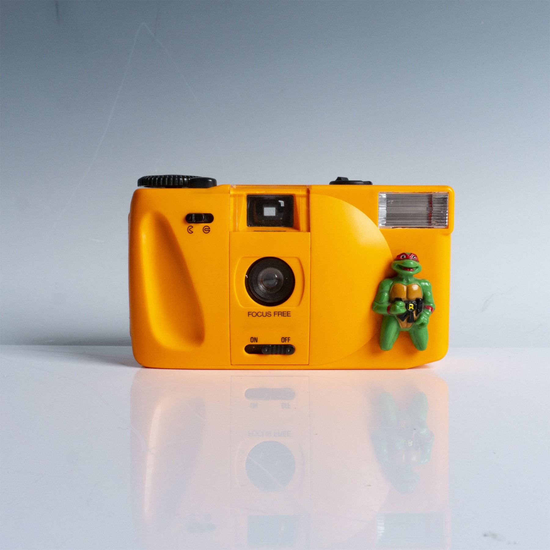 1990 Mirage Studios Teenage Mutant Ninja Turtles focus-free camera in vibrant orange, featuring an attached Raphael figure. Manufactured by Remco Toys, this vintage collectible camera includes the iconic Teenage Mutant Ninja Turtles logo on the side and is marked with original licensing details on the bottom. A nostalgic piece for TMNT enthusiasts and camera collectors alike.