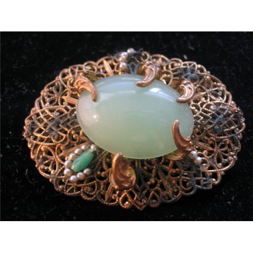 Miriam Haskell A-Symmetrical Brooch with large pale, muted green stone held in place by bronze prong ?claws? on elaborate openwork brass pin with tiny pearl and stone accents