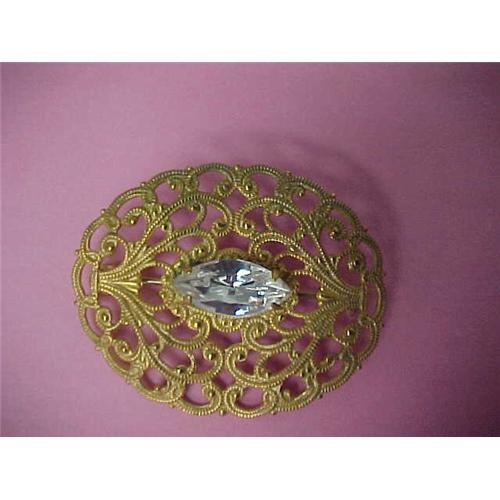 Miriam Haskell Gold Filigree Brooch With Egg Shaped Rhinestone. What a find for a jewelry lover and/or a collector of Miriam Haskell Vintage Jewelry! This exquisite gold tone brooch is over 1 ½? in length and less than that in width. The center stone is egg shaped and about ½? in length. It is surrounded by fine gold filigree. The back is clearly signed Miriam Haskell in the center and the clasp is a standard vintage clasp. Like always, it could use a good cleaning, but what a charmer!