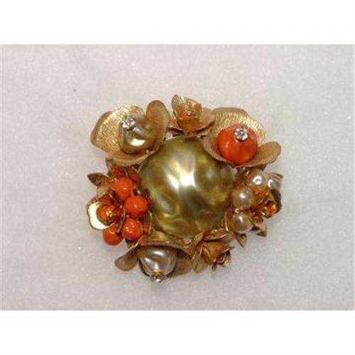 Look at the quality in this fine old Art Deco Brooch. There is a very large pearl in the center. There are small pearls in a flower design on the side with gold toned metal and a tiny orange bead in the center, pictures do not show this. There are 2 larger pearls around the edge with clear hand set sparkling rhinestones in the center. These rhinestones are held firmly intact by individual prongs. There is another flower on the other side with orange beads and gold metal in the center. This pin is in very good condition. Look at the picture of the back, there is hand tied wire to keep all of the individual flowers on the front intact. Yes, my guess is this is entirely hand made and probably Miriam Haskell. Very interesting Vintage Piece. THis brooch or pin is about 2 inches wide