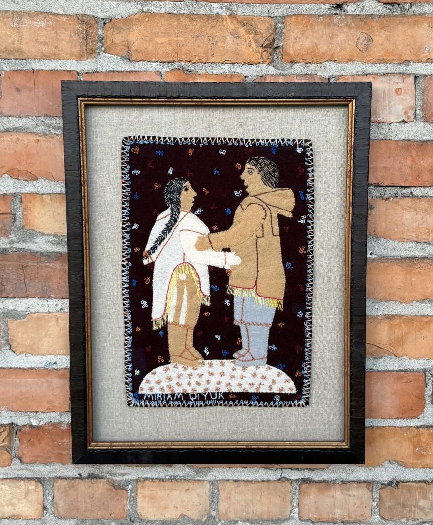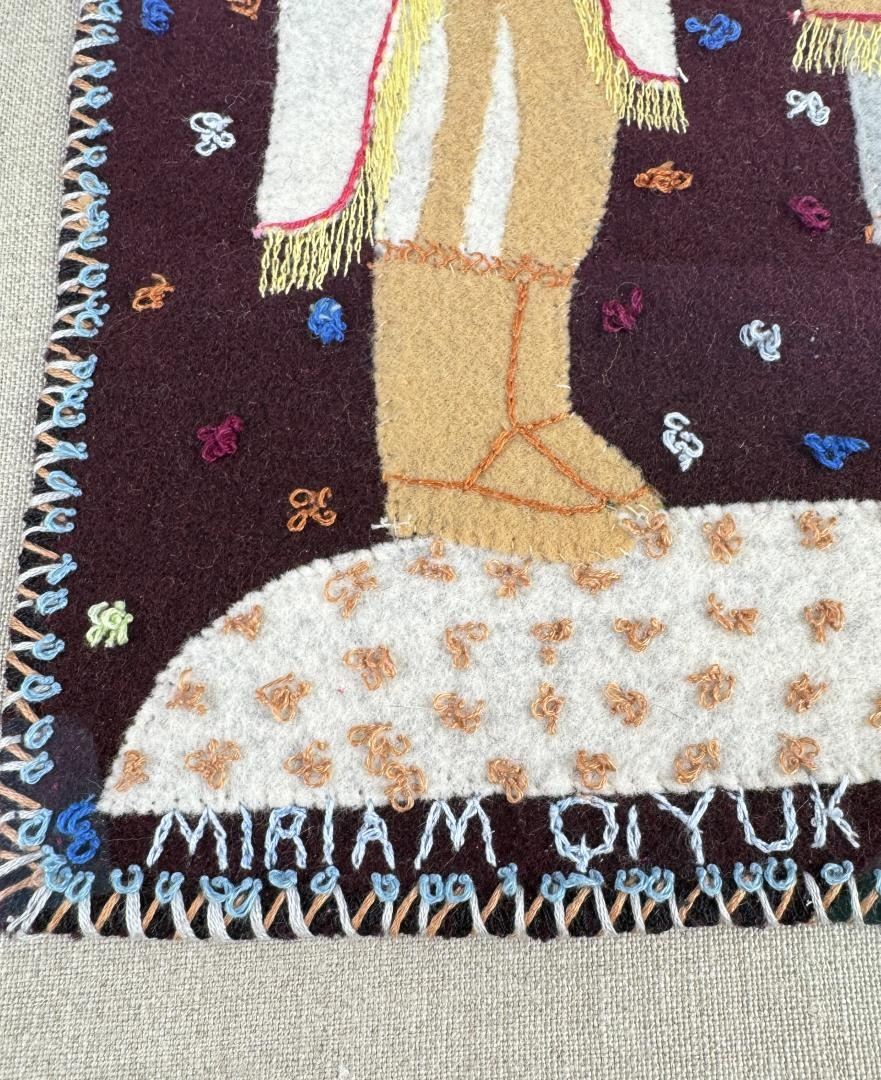 15 3/4" by 18 7/8" framed. Miriam Marealik Qiyuk (1933 - 2016) was active/lived in Northwest Territories / Canada. Miriam Qiyuk is known for Inuit carving, sculpture, textile art, wall hangings, figures, faces. A prominent Canadian Inuit carver, sculptor, and textile artist, Miriam Marealik Qiyuk (aka: Mariam Nanurluk Qiyuk) (disc number* E2-387) was born in the "Back River Area" northwest of Qamani'tuaq (Baker Lake, Northwest Territories) in what is now Nunavut. In about 1958 she moved to Baker Lake with her family and lived there for the rest of her life. Her sculptures and wall hangings were exhibited widely in Canada and the U.S.A. and they are in many important public collections including the Museum of Fine Arts, Boston; the Winnipeg Art Gallery*; and, the National Gallery of Canada. She began her art career in 1960 making wall hangings out of wool, felt, and embroidery floss; but, in 1980, due to a wool allergy, she switched to carving in stone, occasionally accessorizing the works with antler, sinew or wood. Her subjects included groups of figures, faces, family, Inuit legends, human/animal transformation, animals, birds, fantasy, whimsy and Inuit genre. Her style is best described as Inuit Art*. Her askART record has dozens of excellent illustrations of her work. She would be classed as self-taught because our sources make no mention of her art education; but, considering that her mother, Jessie Oonark (see askART), was one of Canada’s most important Inuit artists and the matriarch of large family of artists it is likely that Qiyuk was never far from the influence of talented artists and art dealers.