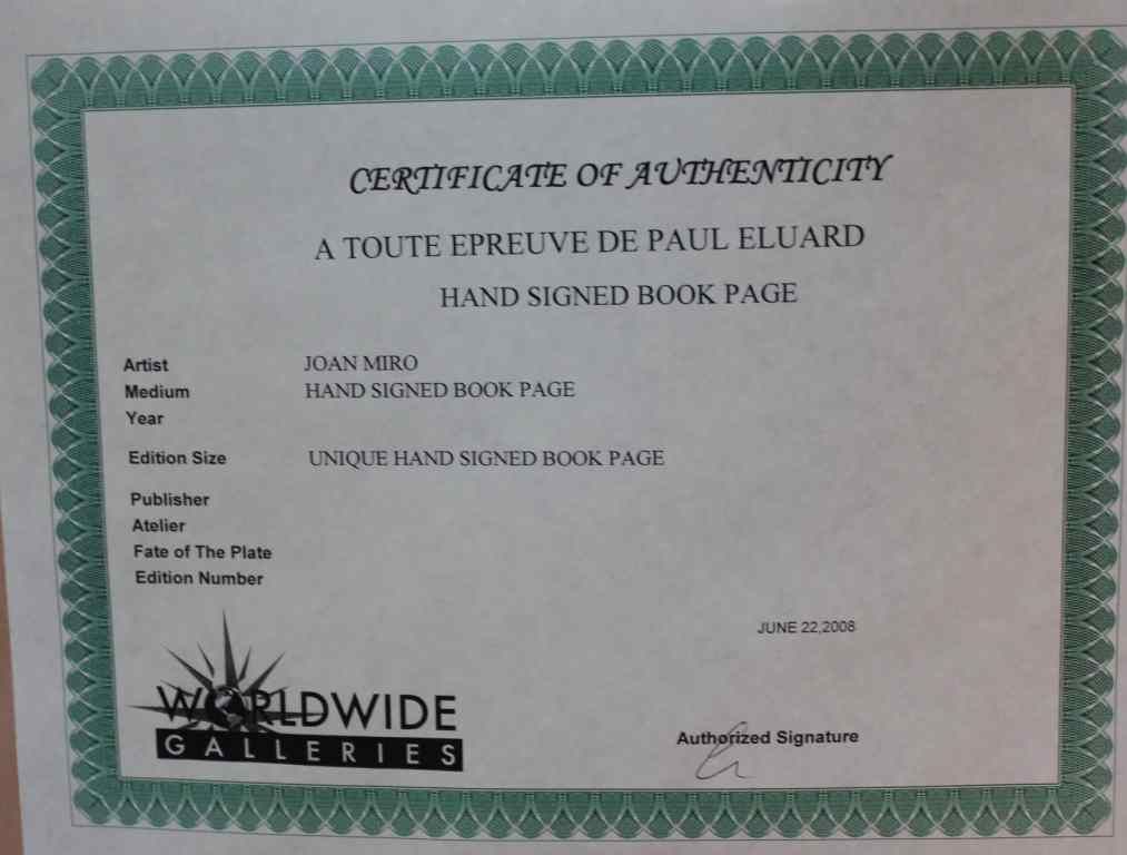 Joan Miro - "A Toute Epreuve De Pauleluard" - Hand Signed By The Artist - Book Plate - Professionally Framed And Matted - Mint Condition - Image Size 11.25" X 9.5" - Framed Size Appx 22.5" X 20.75" - Comes With Certificate Of Authenticity