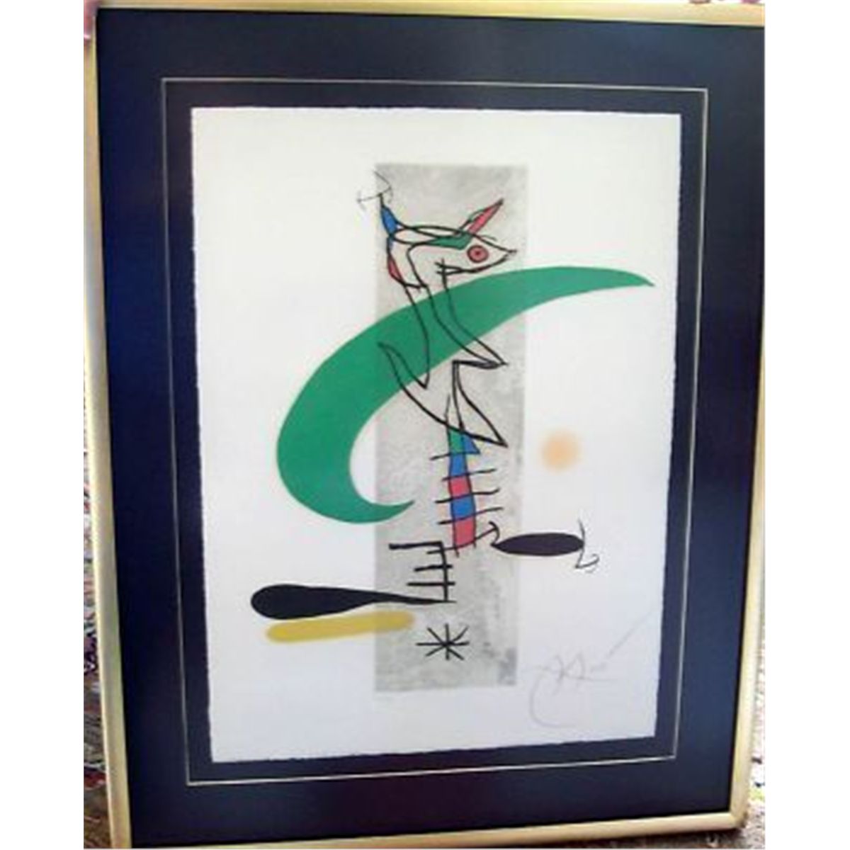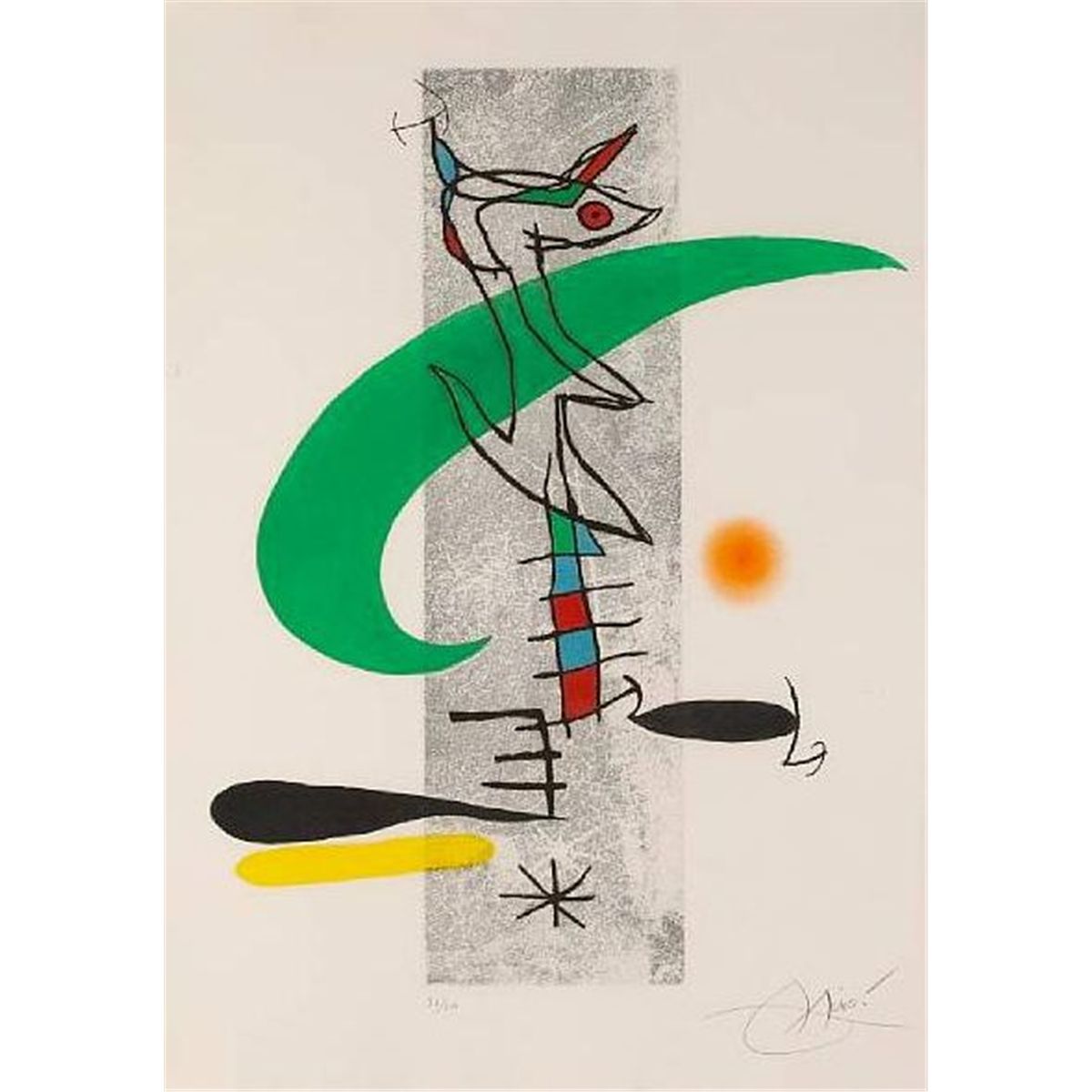 In the final decade of Joan Miro’s life, he devoted himself primarily to the art of printmaking, literally flinging himself headlong into project after project. His retreat from painting was not due to any weakening of his creative abilities or fertile imagination, but rather a focus especially on etching as the chosen means to an end. Miro's large scale aquatints of 1974, such as LE SOMNAMBULE (Sleepwalker), LA FEMME TOUPIE (The Spinning Top Woman), and LE PERMISSIONNAIRE (The Liberty Man) with their magnificent colors and monumental scale encouraged Miro to further these pursuits. This was also a busy period for Robert Dutrou. From 1976 to 1981, Joan Miro created twenty-two compositions in etching, aquatint and carborundum with him, many on a large scale, as well as completing many engravings as illustrations for books. Joan Miro died on December 25, 1983, in Spain.