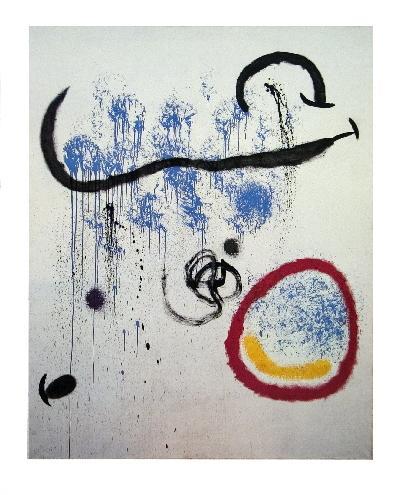 Here are some additional details about the Miro: Limited edition print titled Femme et Oiseau, 1964 by Miro from a painting owned by Galerie Maeght. Offset lithograph on Stonehenge paper. Plate signed, not numbered. Printed on the presses of ARTE, Paris, plates destroyed after printing.